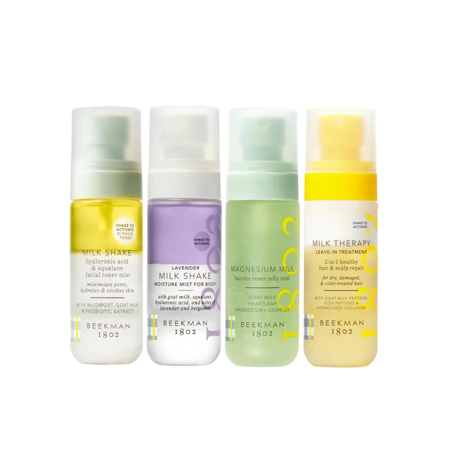 Shake and spray your way to healthy, hydrated skin and hair with this limited-edition set of coveted bestsellers and new launches. Featuring all four of our must-have mists for hair, face and body, this quad is clinically proven to strengthen the skin barrier, boost radiance, and calm sensitive skin. Instantly hydrate and balance skin with our award-winning Milk Shake Facial Toner, transport the skin and the senses with our Milk Shake Scented Body Mist, then soothe redness and irritation with Magnesium Milk Barrier Reset Jelly Mist. This set also includes our NEW Milk Therapy Leave-In Treatment, a 2-in-1 formula for dry, damaged hair that tames unwanted frizz and reduces breakage by 78%. As convenient as they are effective, these products prove that healthy, glowing skin is just a mist (or four) away!