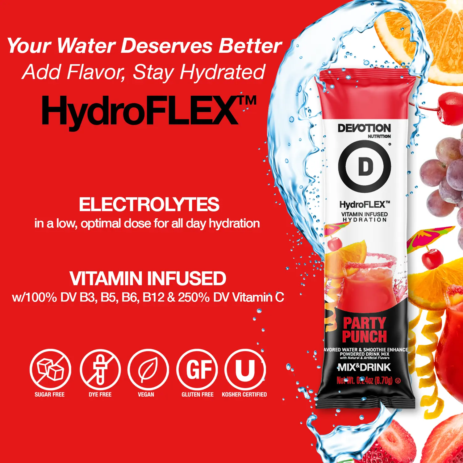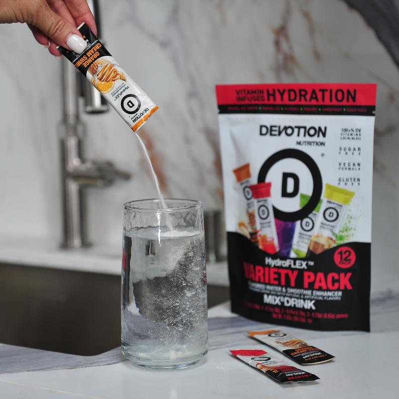 Devotion HydroFLEX™ is the perfect everyday hydration solution, offering a delicious and refreshing way to flavor your water. Designed for use more than once a day, even when you're not exercising, it’s a sugar-free, gluten-free, dye-free, and kosher option with lower sodium content.
