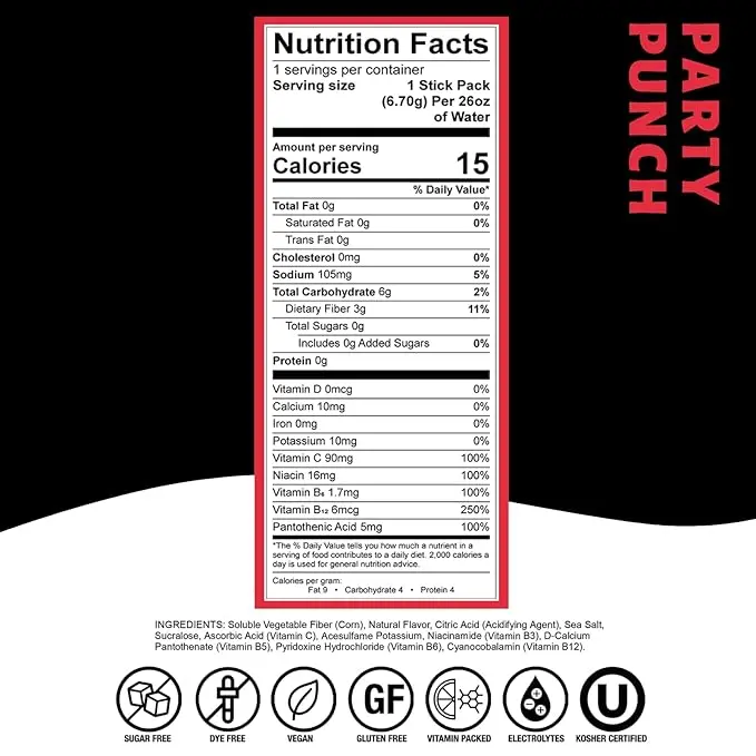 INGREDIENTS: Soluble Vegetable Fiber (Corn), Natural Flavor, Citric Acid (Acidifying Agent), Sea Salt, Sucralose, Ascorbic Acid (Vitamin C), Acesulfame Potassium, Niacinamide (Vitamin B3), D-Calcium Pantothenate (Vitamin B5), Pyridoxine Hydrochloride (Vitamin B6), Cyanocobalamin (Vitamin B12).
