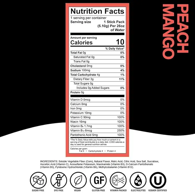 INGREDIENTS: Soluble Vegetable Fiber (Corn), Natural Flavor, Malic Acid, Citric Acid (Acidifying Agent), Sea Salt, Sucralose, Ascorbic Acid (Vitamin C), Acesulfame Potassium, Niacinamide (Vitamin B3), D-Calcium Pantothenate (Vitamin B5), Pyridoxine Hydrochloride (Vitamin B6), Methylcobalamin (Vitamin B12).