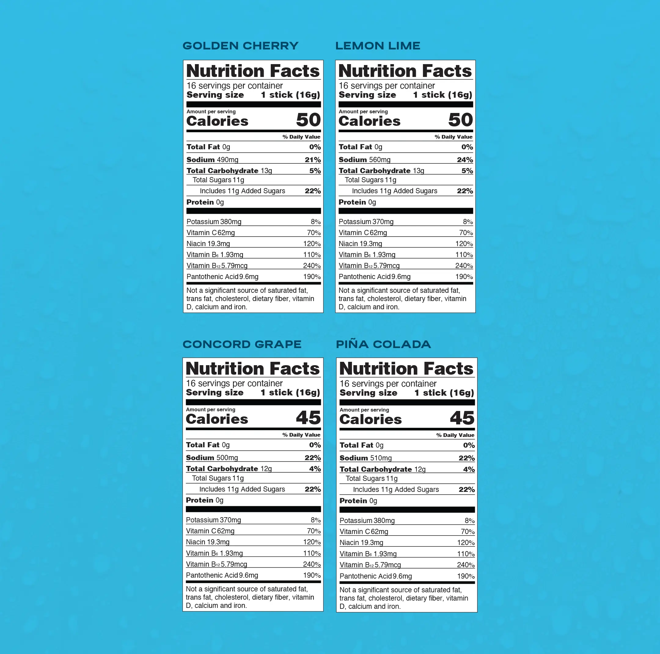 You can't go wrong with these fan-favorite flavors. Includes a 16ct pouch of Concord Grape Hydration Multiplier®, 16ct pouch of Golden Cherry Hydration Multiplier®, 16ct pouch of Piña Colada Hydration Multiplier® and 16ct pouch of Lemon Lime Hydration Multiplier®.