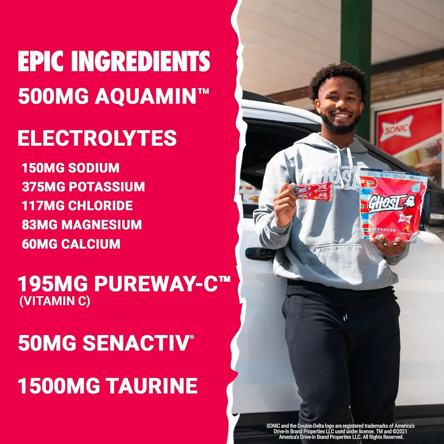 Take Your Water to New Heights: GHOST Hydration is packed with a mighty dose of Taurine, PureWay-C (the GOAT Vitamin C), Senactiv, Aquamin for added hydration, and a stacked base of Electrolytes including Sodium, Potassium, Chloride, Magnesium and Calcium.