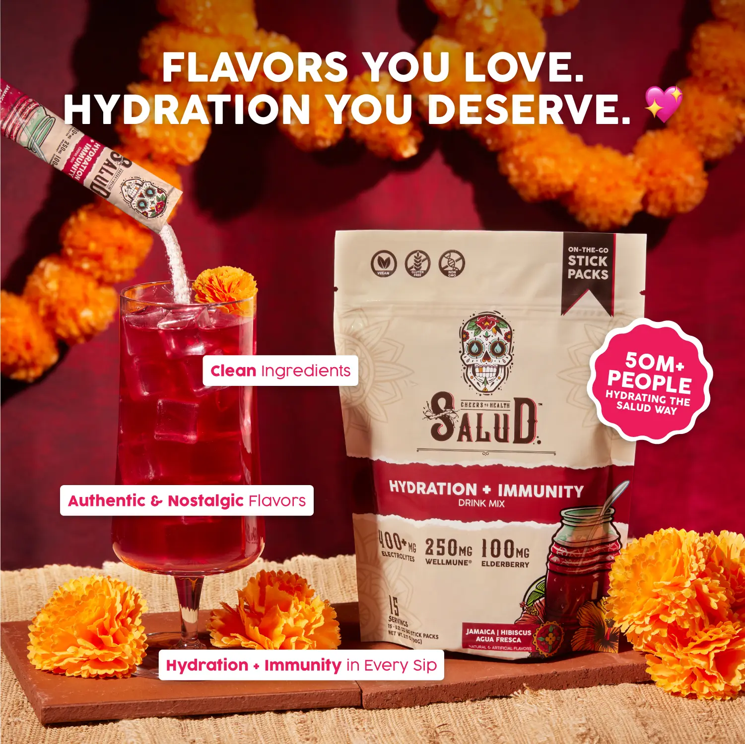 Salud 2-in-1 [Hydration & Immunity - Jamaica | Hibiscus] 400mg Electrolytes, 250mg Wellmune, 100mg Elderberry, Dairy & Soy Free, Non-GMO, Gluten Free - Healthcare, Vitamin (15 Servings), Spring Glow Up