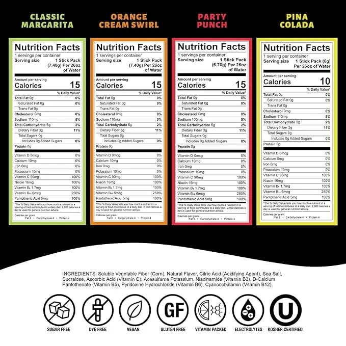 ORIGINAL VARIETY PACK INGREDIENTS: Soluble Vegetable Fiber (Corn), Natural Flavor, Citric Acid (Acidifying Agent), Sea Salt, Sucralose, Ascorbic Acid (Vitamin C), Acesulfame Potassium, Niacinamide (Vitamin B3), D-Calcium Pantothenate (Vitamin B5), Pyridoxine Hydrochloride (Vitamin B6), Cyanocobalamin (Vitamin B12).Â