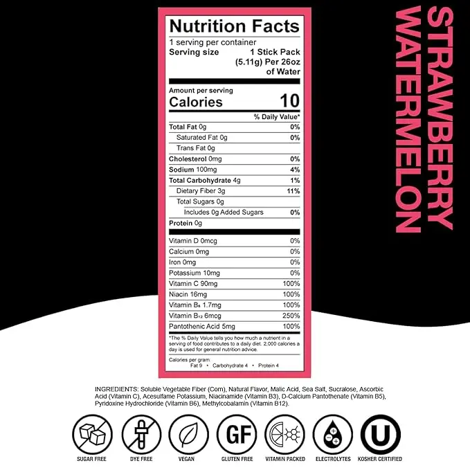 INGREDIENTS: Soluble Vegetable Fiber (Corn), Natural Flavor, Malic Acid, Sea Salt, Sucralose, Ascorbic Acid (Vitamin C), Acesulfame Potassium, Niacinamide (Vitamin B3), D-Calcium Pantothenate (Vitamin B5), Pyridoxine Hydrochloride (Vitamin B6), Methylcobalamin (Vitamin B12).