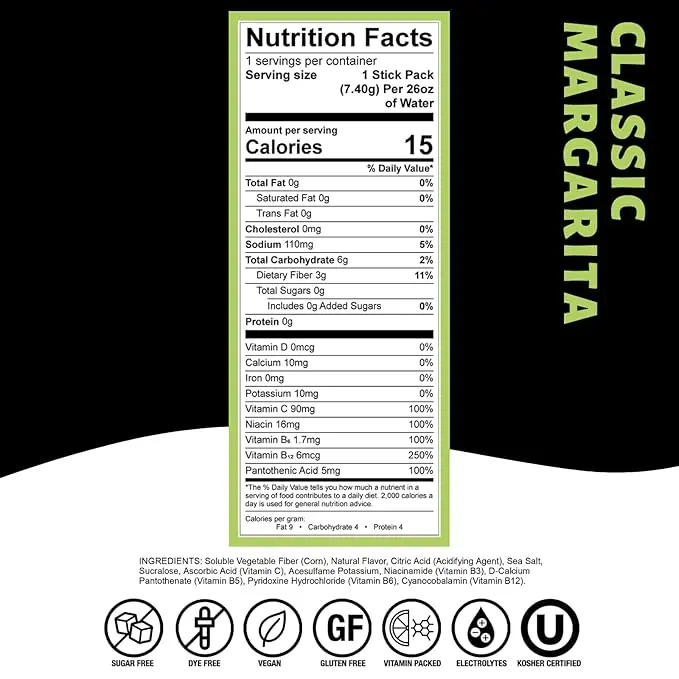 INGREDIENTS: Soluble Vegetable Fiber (Corn), Natural Flavor, Citric Acid (Acidifying Agent), Sea Salt, Sucralose, Ascorbic Acid (Vitamin C), Acesulfame Potassium, Niacinamide (Vitamin B3), D-Calcium Pantothenate (Vitamin B5), Pyridoxine Hydrochloride (Vitamin B6), Cyanocobalamin (Vitamin B12).