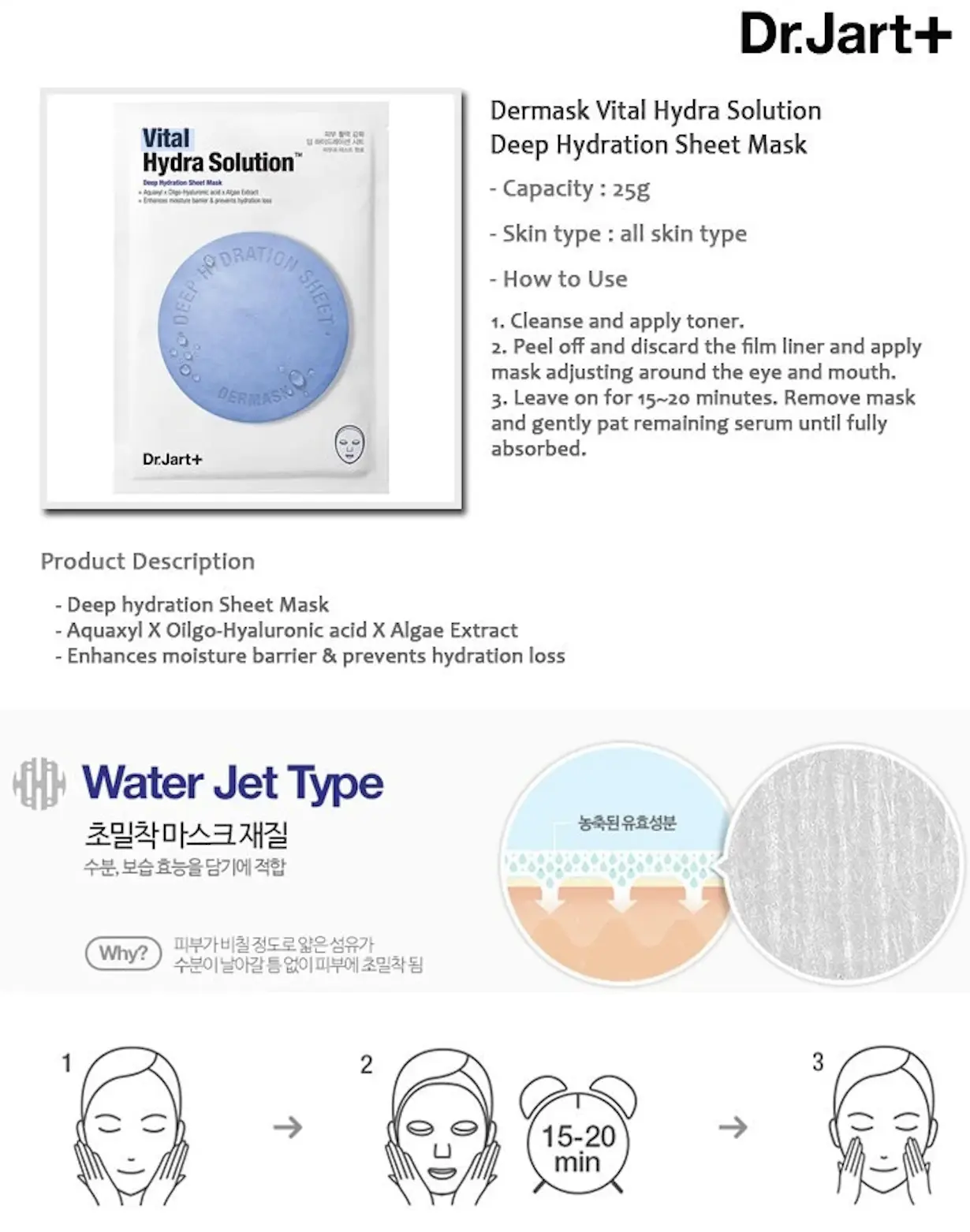 Pamper your skin with Dr.Jart+ Vital Hydra Solution Deep Hydration Sheet Masks, a pack of 5 masks designed to provide deep hydration to your skin. Made by the renowned brand Dr. Jart, these sheet masks are a must-have in your skincare routine.