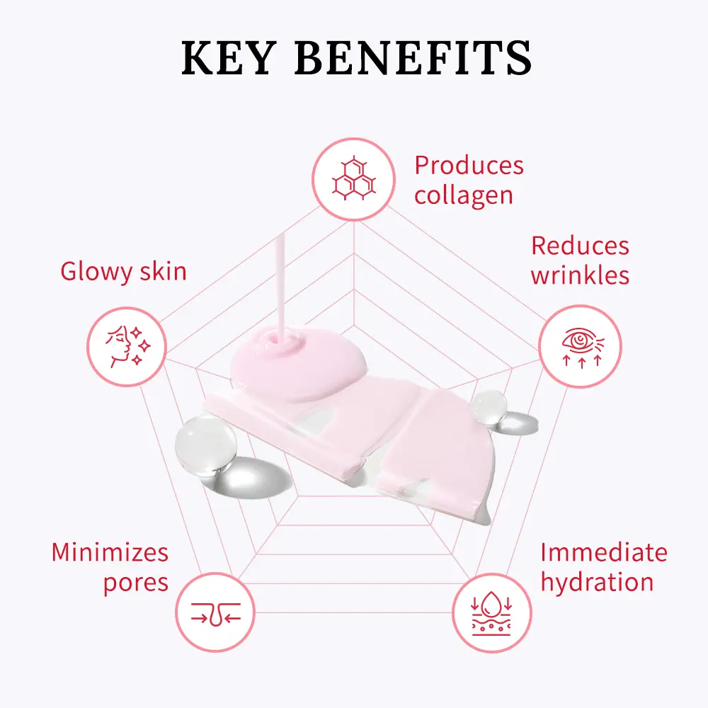 Jelly-like pink mask is formulated with real collagen instantly absorbs into the skin which helps to hydrate the skin’s surface and penetrate deeper layers even after removing the mask.