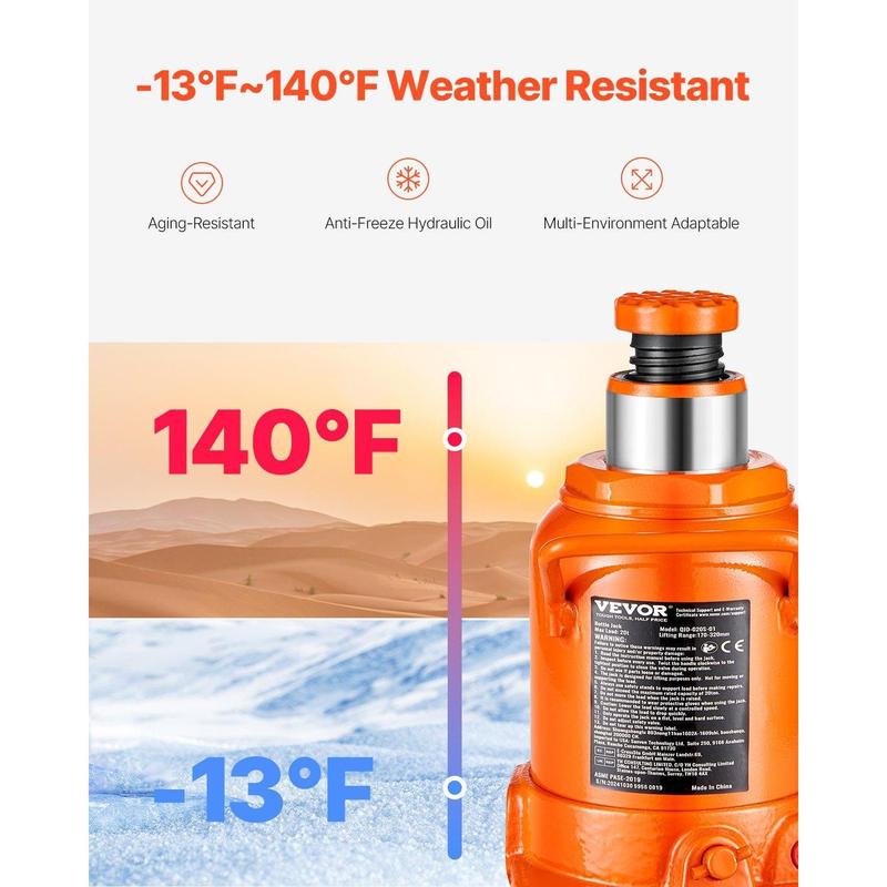 ·Leak-Proof Design: This hydraulic jack features precision industrial welding, with sealed connections to prevent leaks. It’s designed for all-weather use, with a temperature range of -13℉ to 140℉, ensuring reliable performance and reducing the risk of part aging and hydraulic oil freezing.
