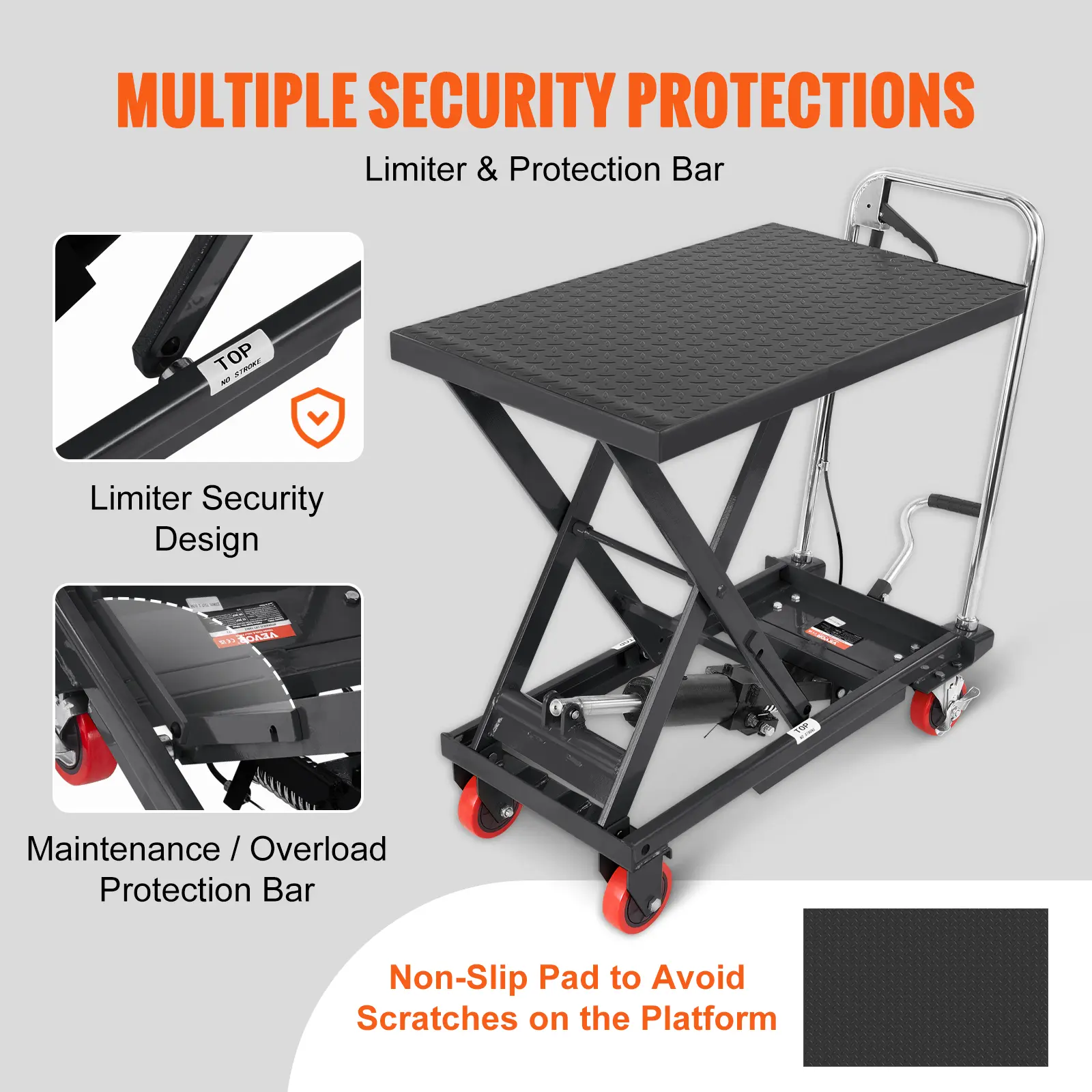 • Secure Design: Our hydraulic table cart incorporates thoughtful security features, including limiter protection to prevent over-lifting. It also features a maintenance/overload protection bar for easy maintenance. For added stability during transport, we provide a rubber non-slip pad that prevents movement and enhances overall stability.