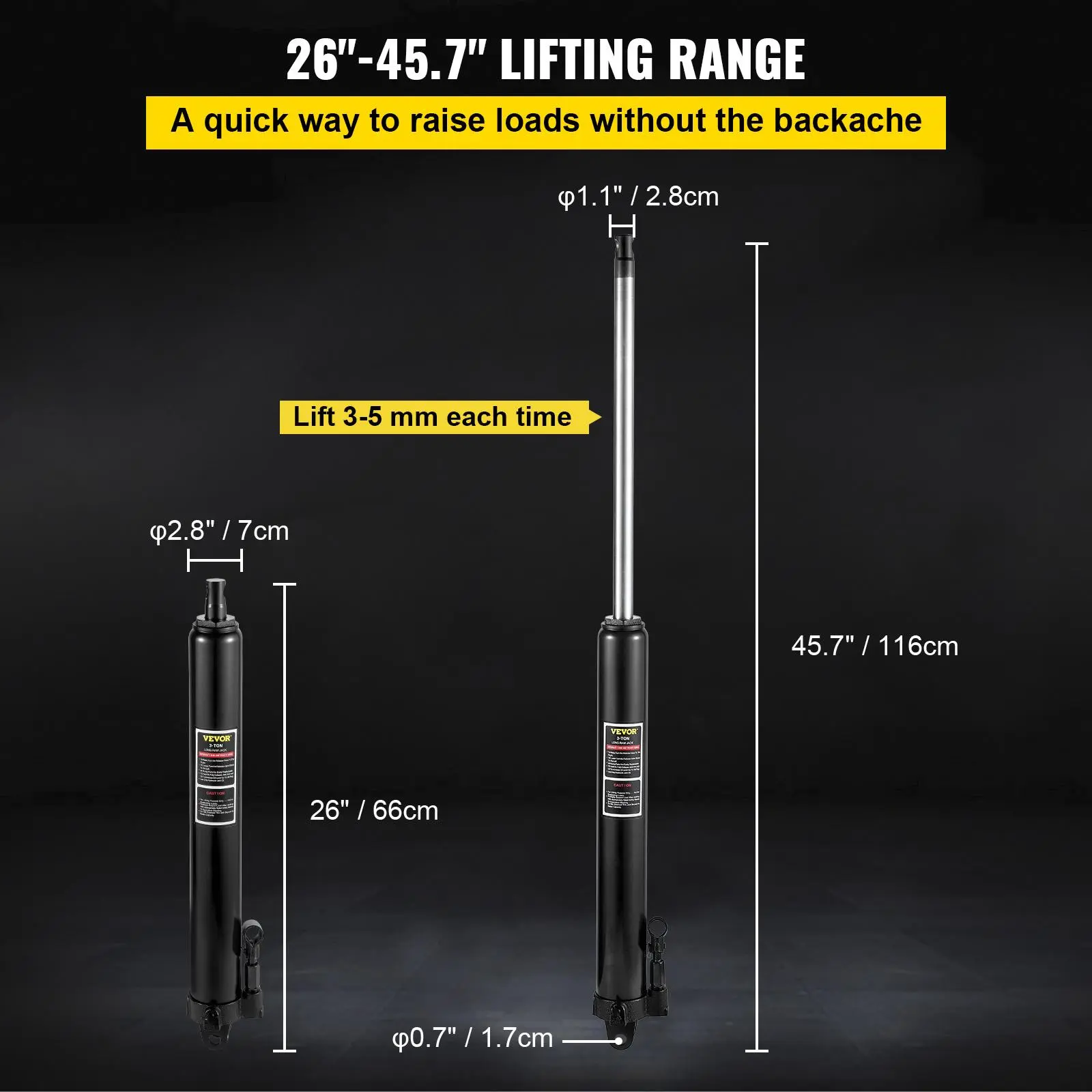 • 26" -45.7" Lifting Range: Minimum height: 26 in/66 cm. Maximum height: 45.7 in/116 cm. The long ram hydraulic round bottom jack provides an ample 19.7 in/50 cm stroke for the optimal lift of objects up to 3 ton/6600 lb. in weight. And the slow release function for reliability and security.
