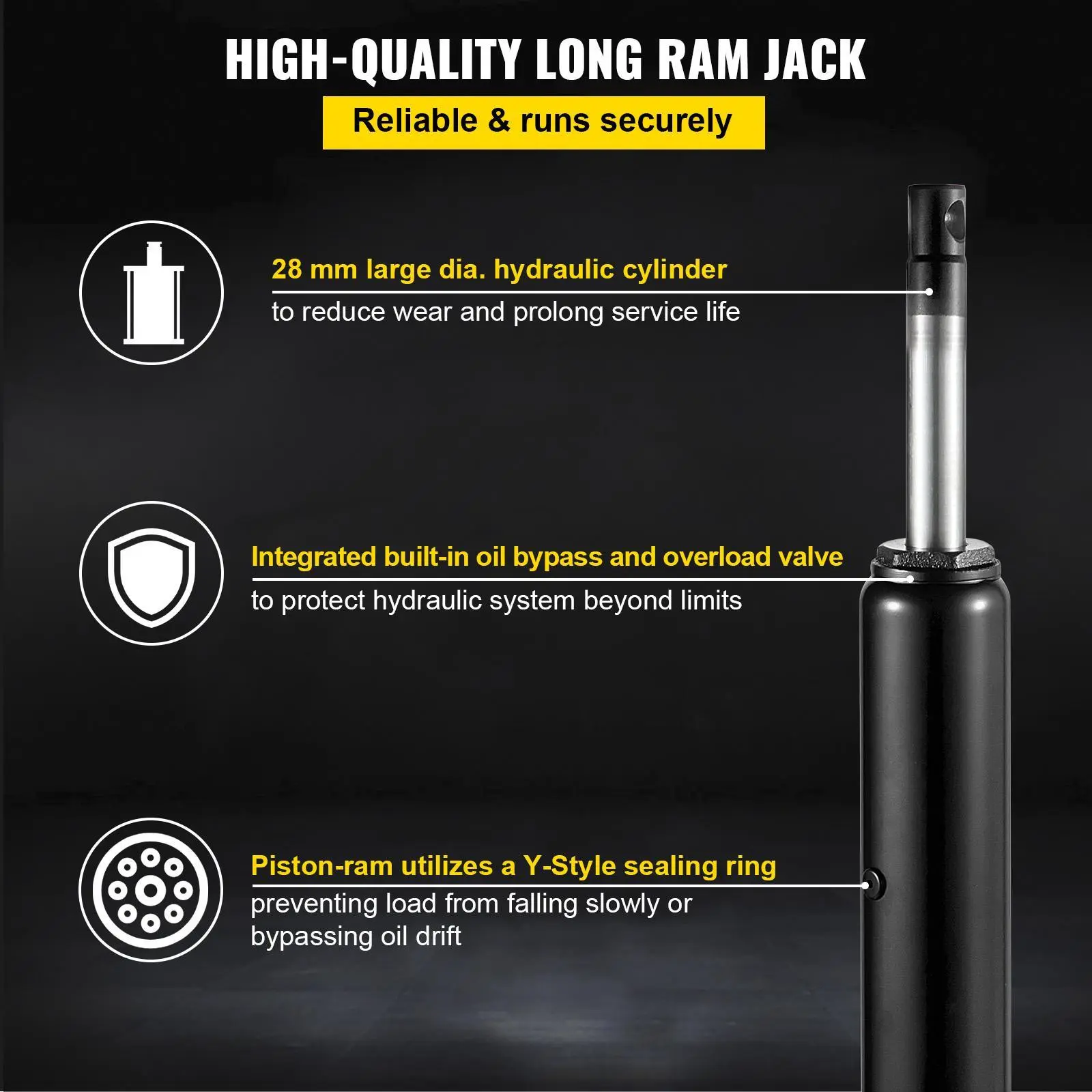 • Reliable & Durable Jack: Large diameter hydraulic steel cylinder unit results in lower oil pressure needed to move the load, which helps to reduce wear and extend service life. The piston-ram is treated and polished to resist skiving and utilizes a Y-Style polyurethane sealing ring with a backup ring, preventing the load from falling slowly or bypassing oil drift.