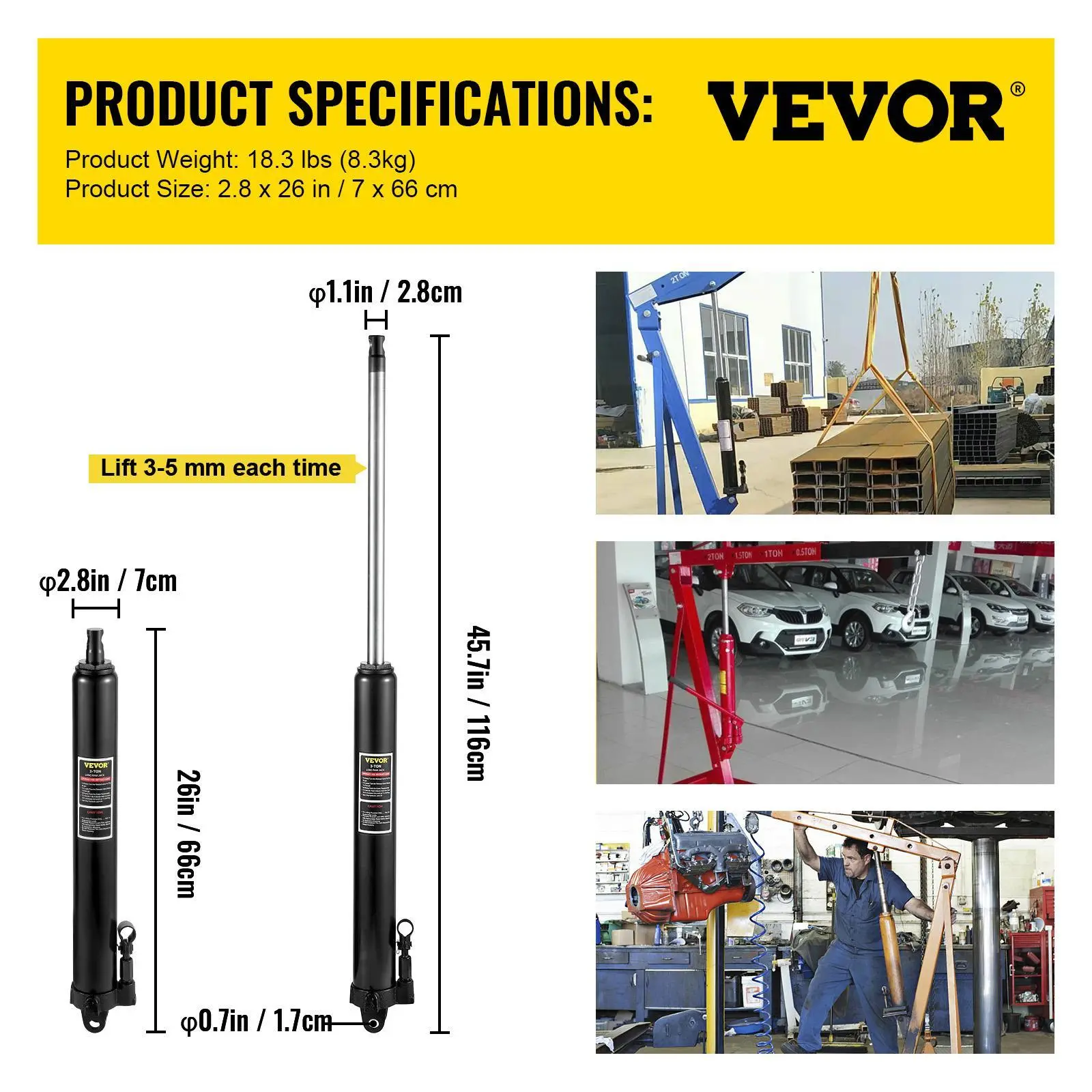 • Handles up to 3-Ton: This 3-Ton capacity long ram hydraulic jack helps you convert your existing hoist to a convenient and fast one. A quick way to raise loads without the backache. A must-have for hydraulic cranes, engine hoists, and a wide variety of applications.