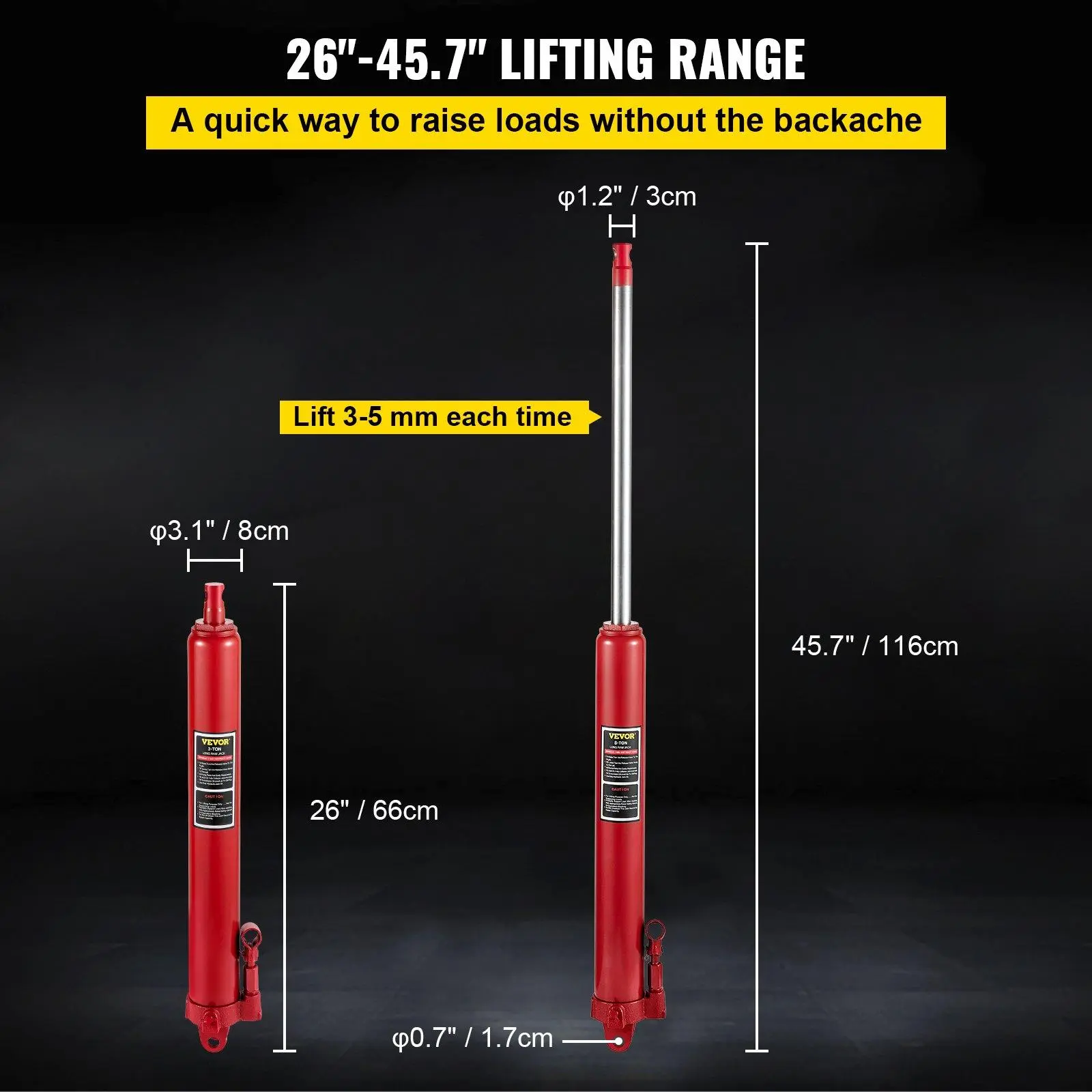 ·26" -45.7" Lifting Range: Minimum height: 26 in/66 cm. Maximum height: 45.7 in/116 cm. The long ram hydraulic round bottom jack provides an ample 19.7 in/50 cm stroke for the optimal lift of objects up to 8 ton/17363 lb. in weight. And the slow release function for reliability and security.