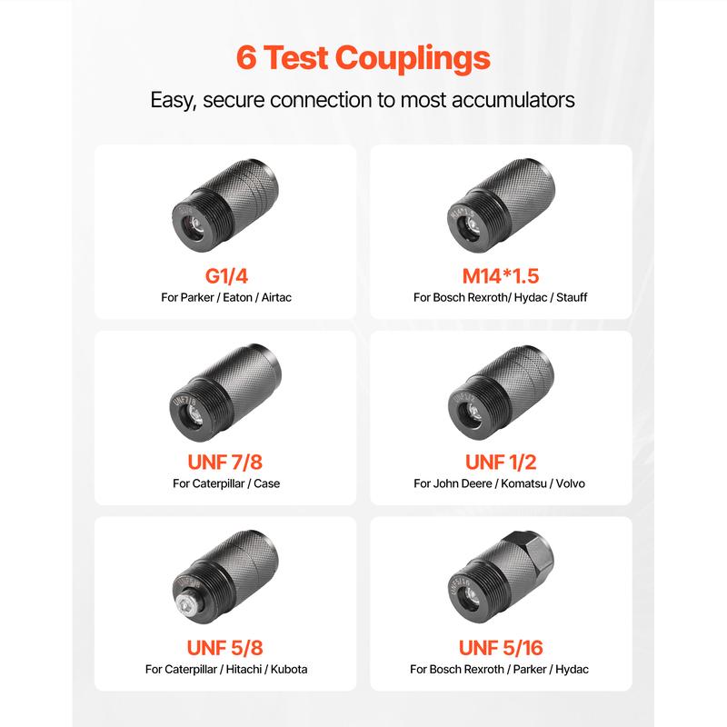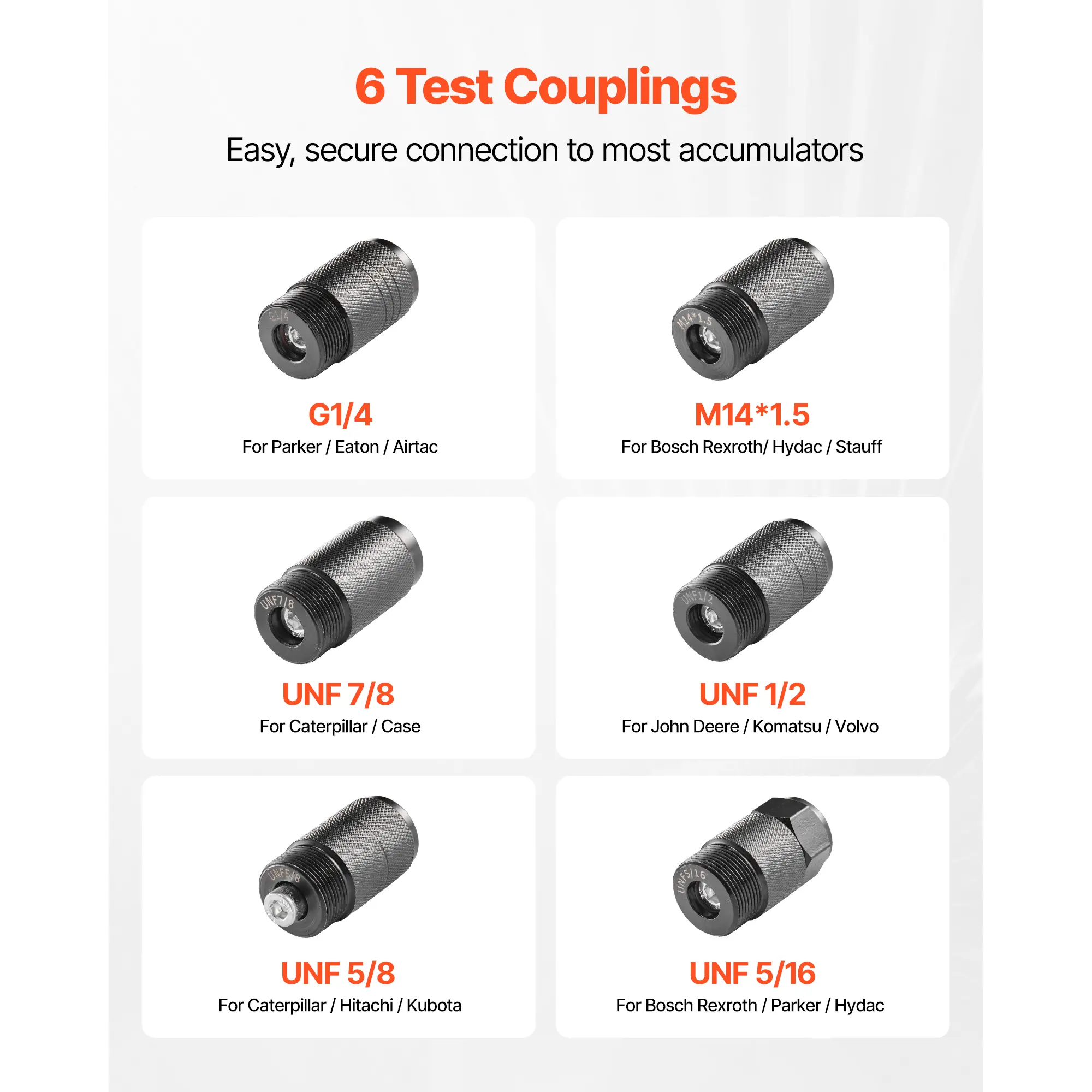 • Nitrogen Filling & Testing: This kit measures 1500/4000/6000 PSI. It includes three pressure gauges, six couplings, a hose, an adapter, and a nitrogen filling connector. Perfect for accumulator nitrogen charging and pressure testing.