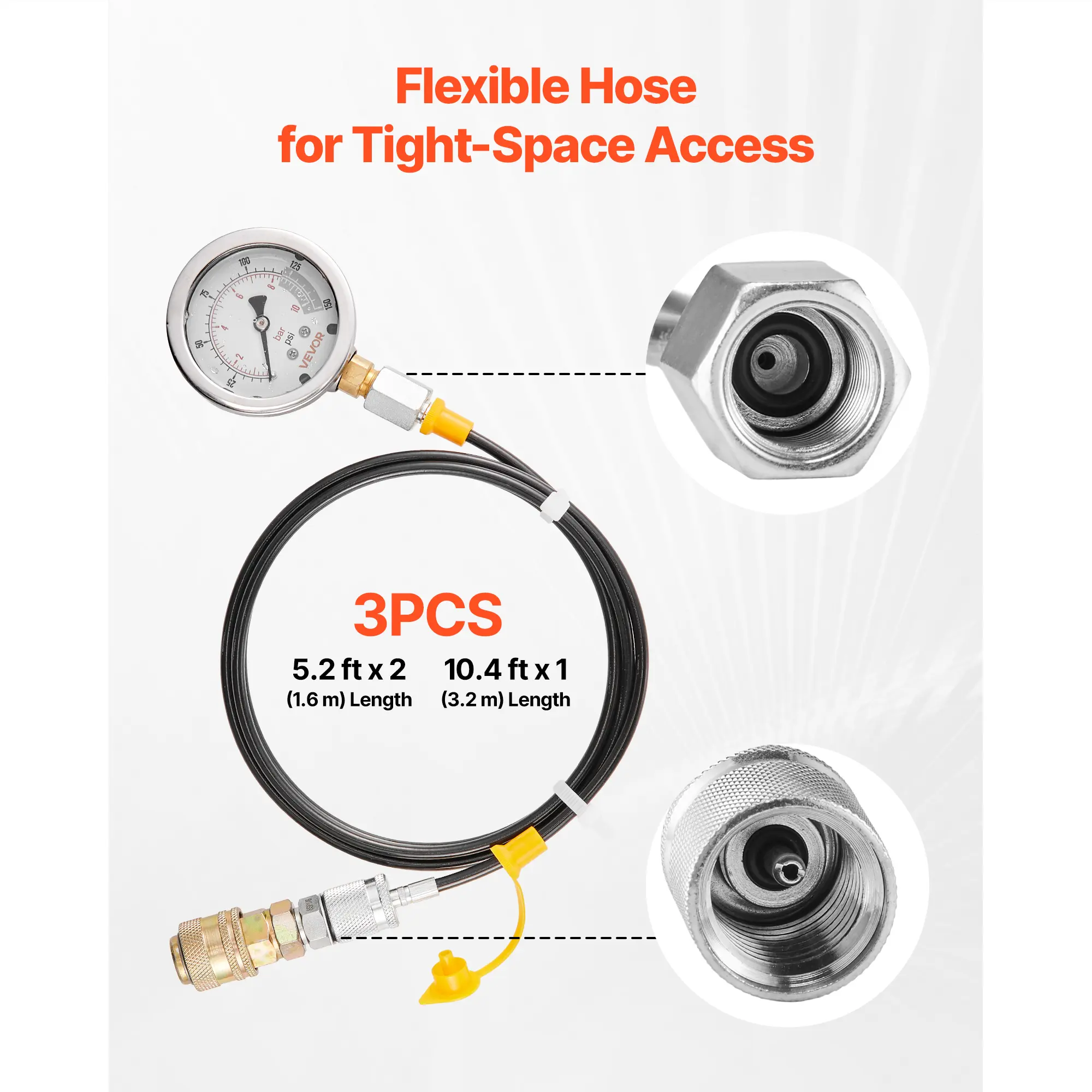 • Wide Compatibility: Covers G, M, UNF, and NPT thread types. Type B and Type C quick connectors fit multiple hydraulic systems. Flexible hoses extend into narrow testing points.