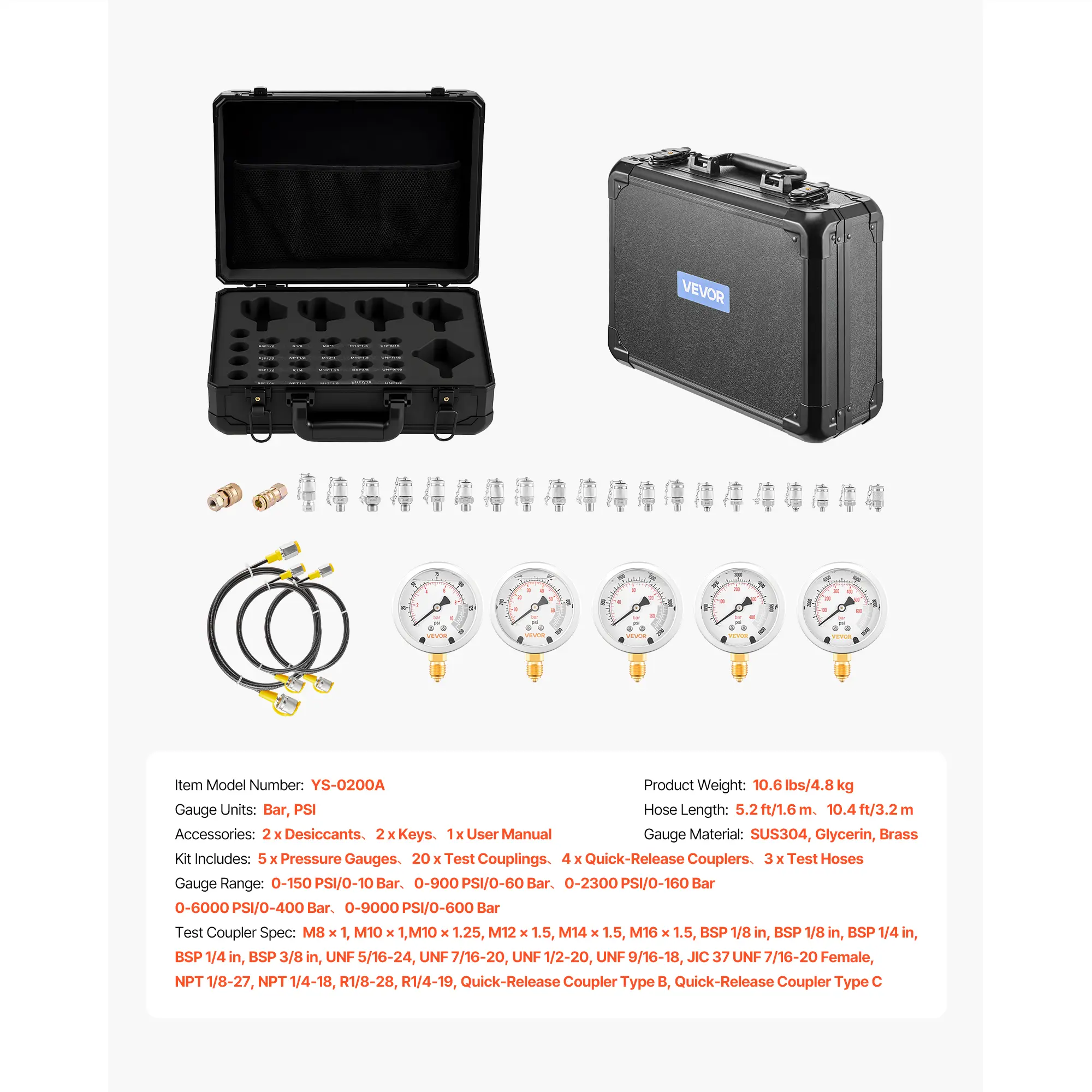 • Complete Kit: This kit offers five pressure ranges (10/60/160/400/600 Bar). It includes five gauges, twenty couplings, four quick couplers, and three hoses. Perfect for low, medium, and high-pressure hydraulic systems.
