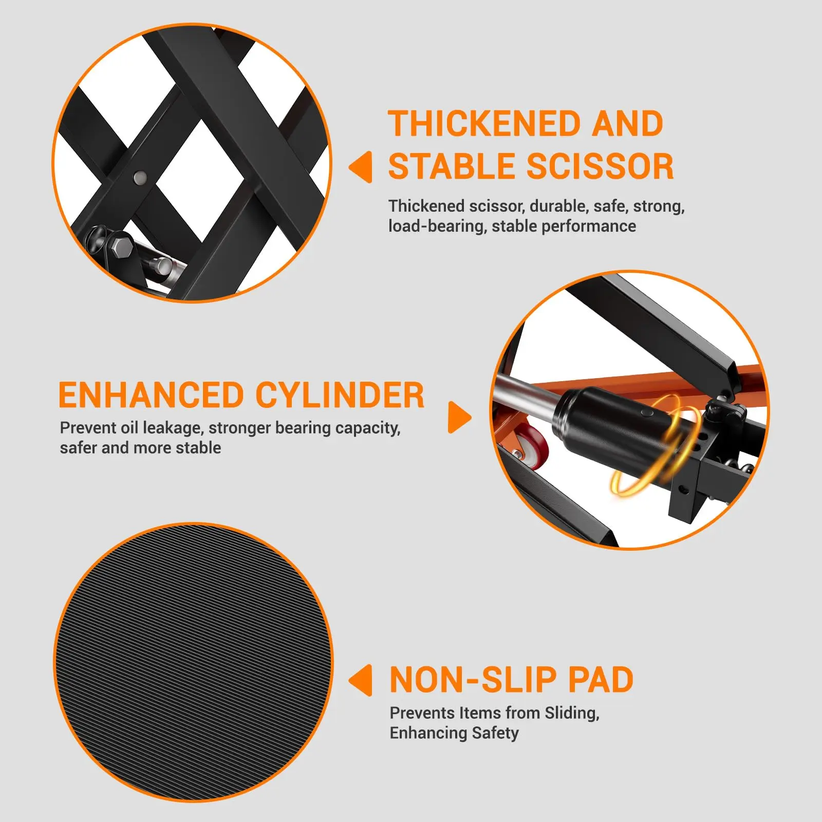 · [Safety Features] Designed with multiple safety elements, this hydraulic table cart includes a locking device to prevent movement when stationary, limiter protection against over-lifting, a maintenance/overload protection bar for easy upkeep, and a rubber no-slip pad to enhance cargo stability during transport.