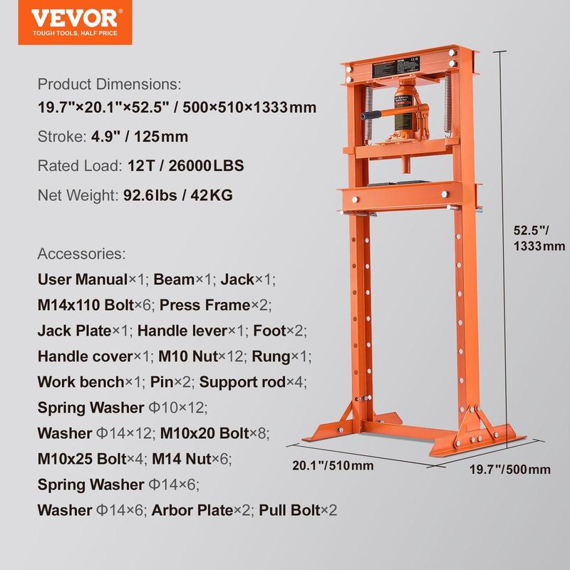 ·12-Ton Strong Loading Capacity: Whether you're a seasoned professional or a DIY enthusiast, our hydraulic shop press is the perfect tool for removing and installing automobile bushings, bearings, ball joints, U-joints, pulleys, gears, and more. This press can also be used for metalworking tasks like bending, straightening, and stamping. Get the job done quickly and easily.