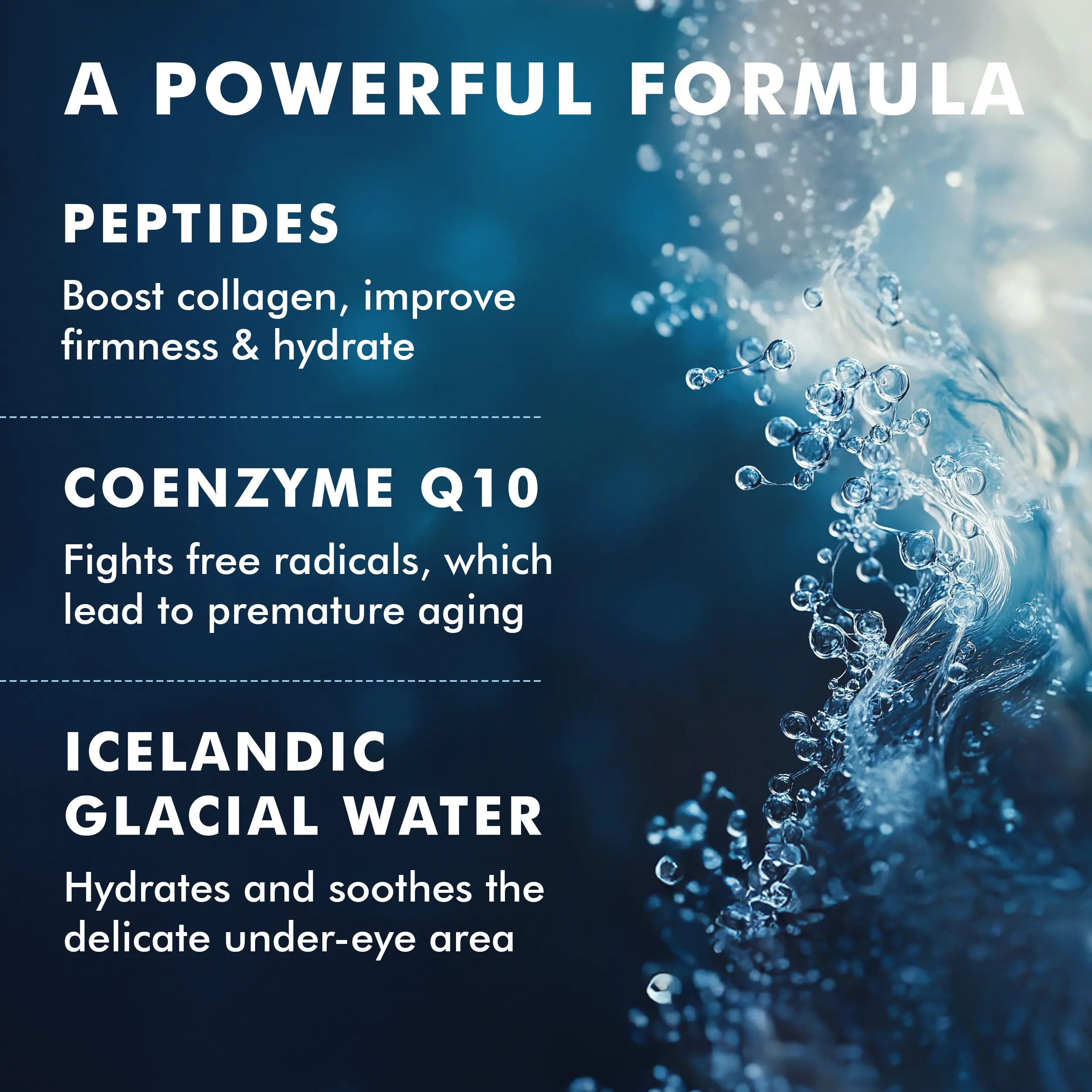 These cooling patches pair Icelandic Glacial Water with Arctic Cranberry Seed Oil to hydrate and protect the delicate eye area while Peptides and Coenzyme Q10 smooth fine lines and restore firmness. Designed for instant results, they leave tired eyes de-puffed, refreshed and revitalized.