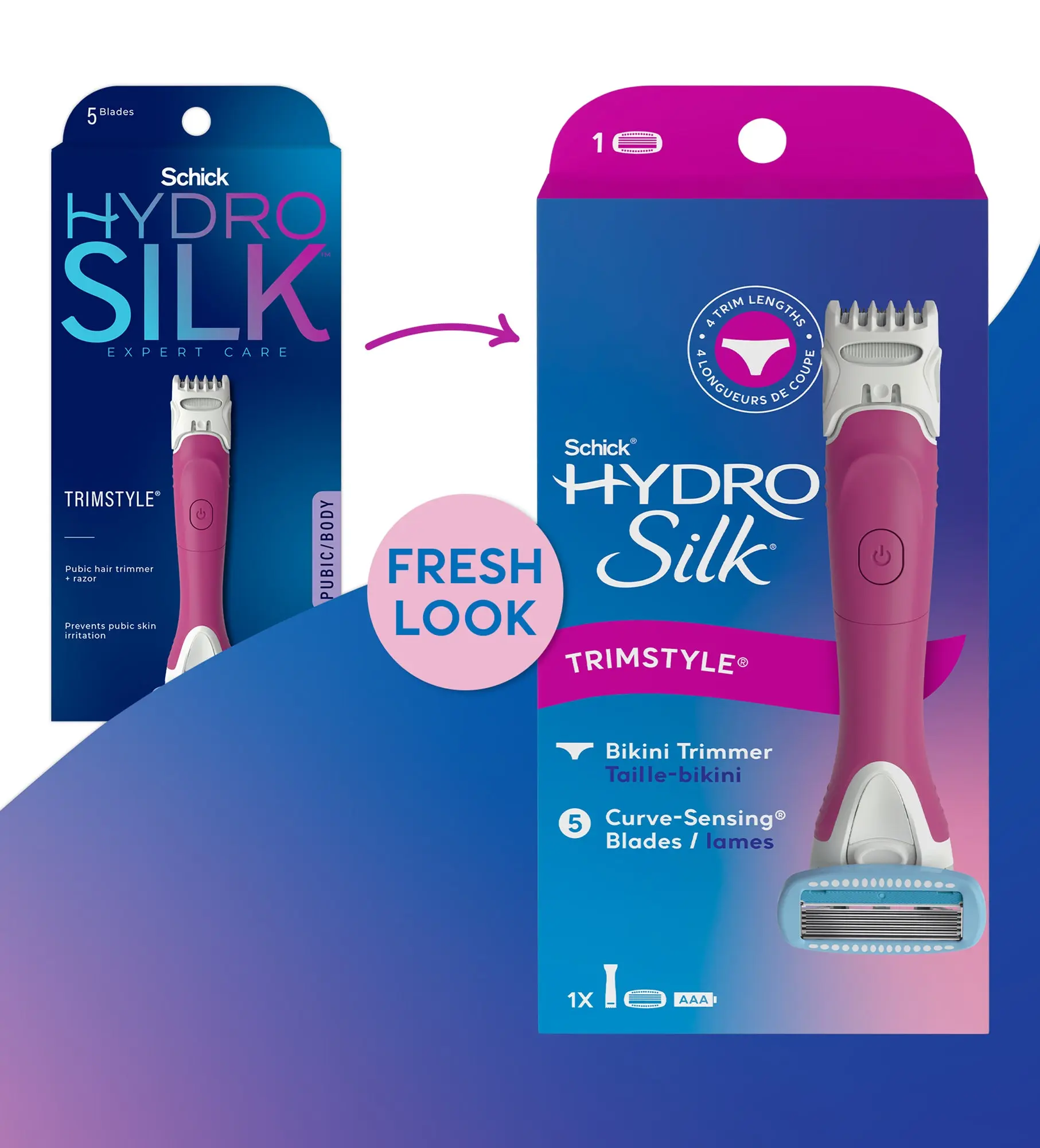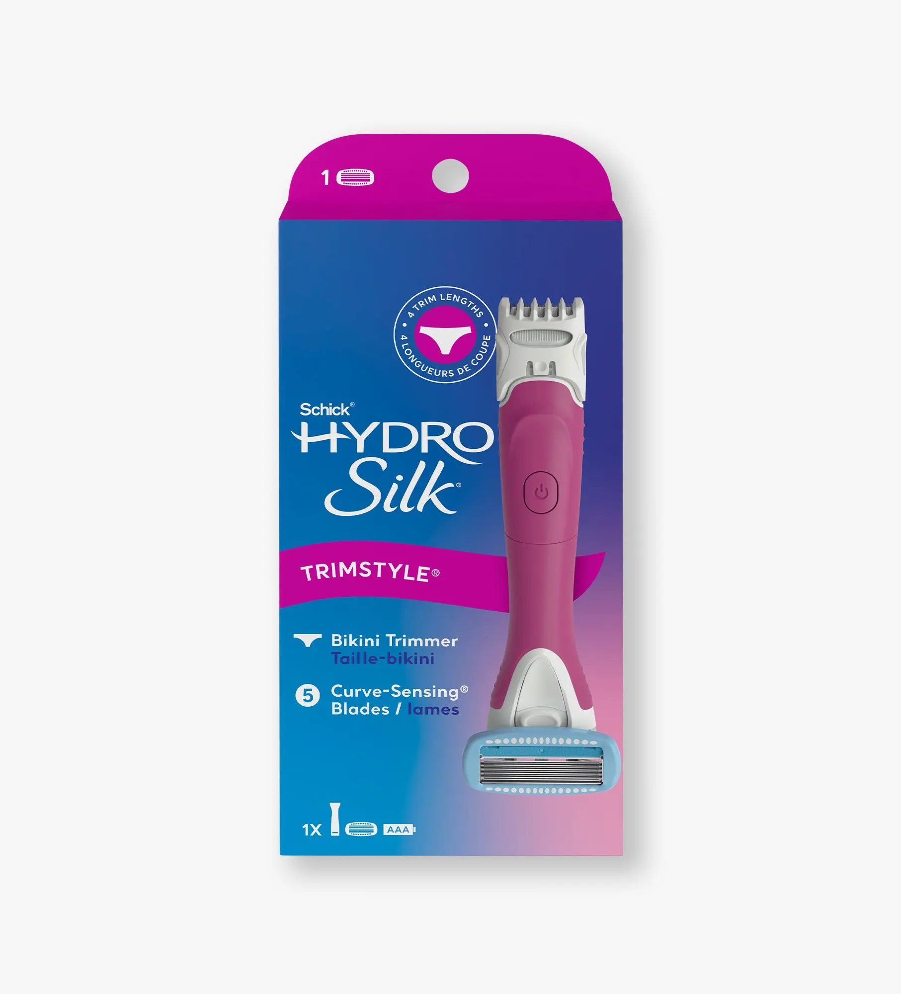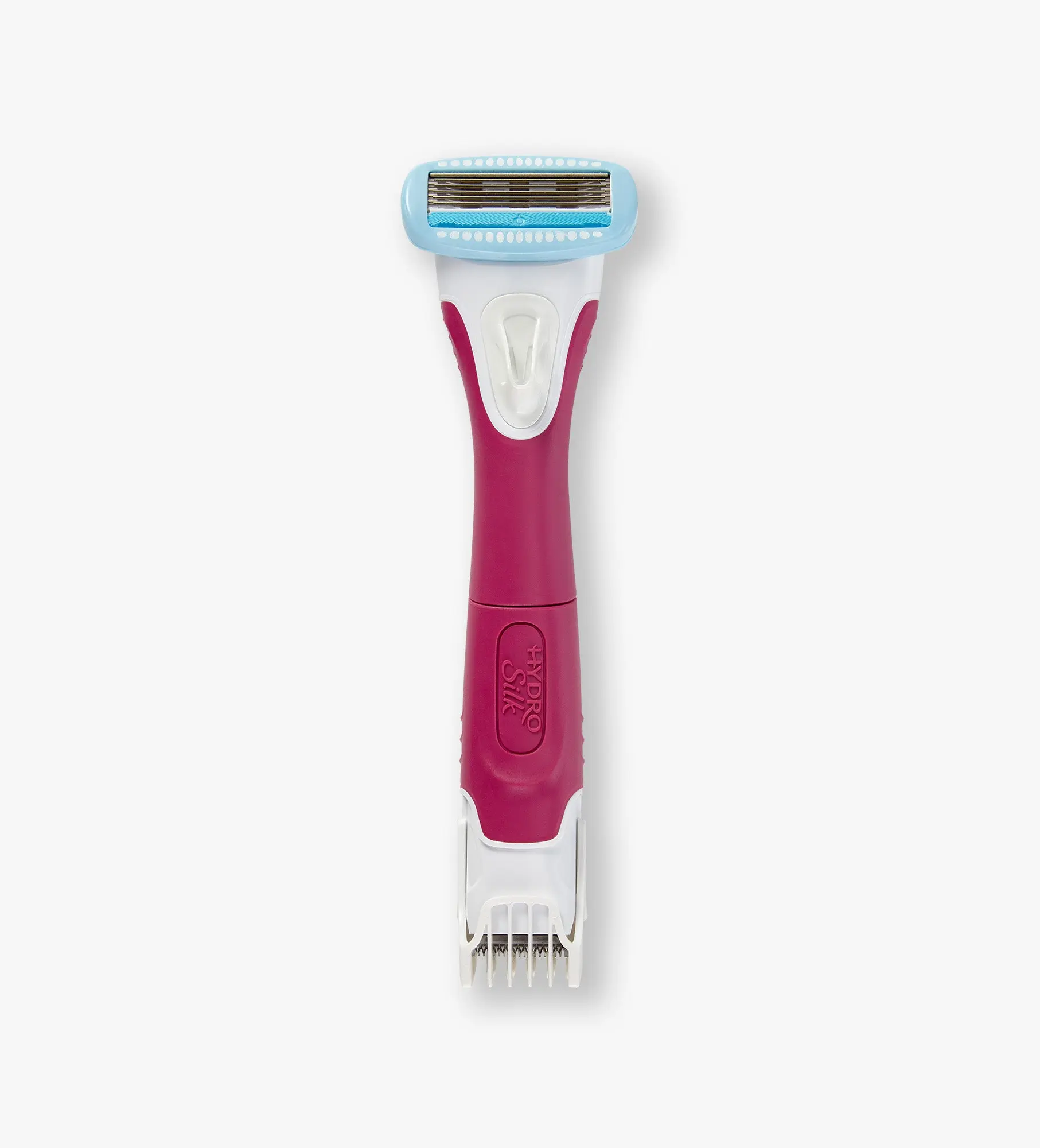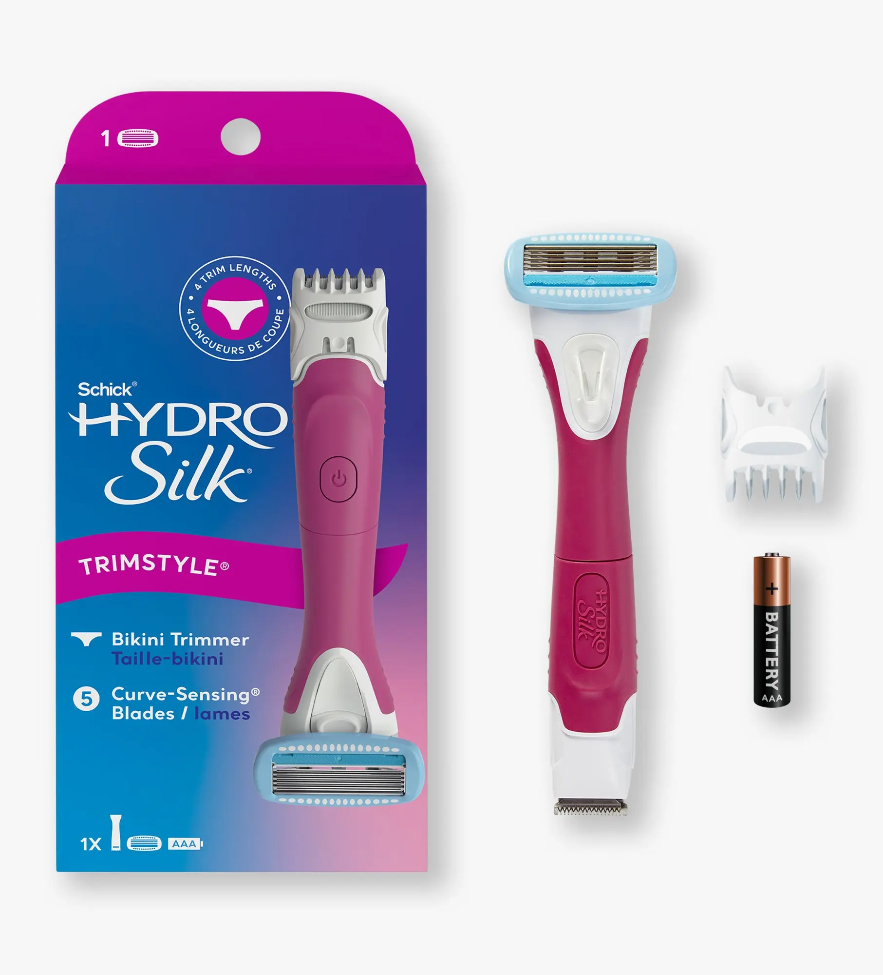 Meet your new go-to razor—Schick® Hydro Silk® TrimStyle. The 2-in-1 razor and bikini trimmer for women that’s designed to handle it all—so there’s hair where you want it and none where you don’t! One side is a waterproof women’s pubic hair trimmer with 4 different trim lengths, so you’re always in control of your look. On the other side is a smooth-gliding women’s razor with 5 Curve Sensing® blades and Hydra-Boost® Serum for lasting hydration*. Because there’s smooth, then there’s Schick® Hydro Silk®.