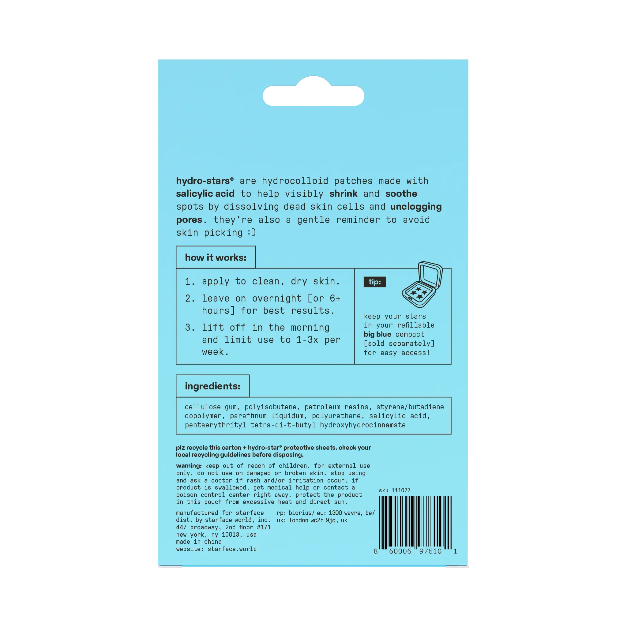 AWESOME FORMULA! I WEAR THESE ON JUICY PIMPS AFTER I'VE MESSED WITH THEM A LITTLE. THESE PATCHES ARE A GREAT ADDITION TO THE OTHERS BECAUSE THEY DRY UP THE BLEMISH REAL NICE. I LIKE TO WEAR THESE AT NIGHT WITH THE REST OF MY SKIN CARE AND IN THE MORNING THE BLEMISH IS USUALLY ALREADY DRIED UP AND READY FOR HEALING WITH A REGULAR PATCH. LOVE THAT THEY ARE A DIFFERENT COLOR SO IT'S EASY TO TELL APART FROM THE OTHER STARS.