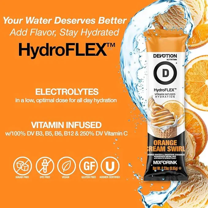 Devotion HydroFLEX™ is the perfect everyday hydration solution, offering a delicious and refreshing way to flavor your water. Designed for use more than once a day, even when you're not exercising, it’s a sugar-free, gluten-free, dye-free, and kosher option with lower sodium content.