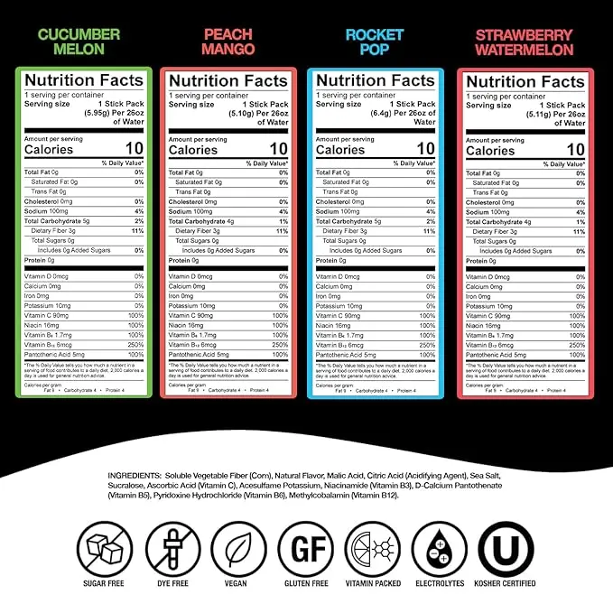 INGREDIENTS: Soluble Vegetable Fiber (Corn), Natural Flavor, Malic Acid, and/or Citric Acid (Acidifying Agent), Sea Salt, Sucralose, Ascorbic Acid (Vitamin C), Acesulfame Potassium, Niacinamide (Vitamin B3), D-Calcium Pantothenate (Vitamin B5), Pyridoxine Hydrochloride (Vitamin B6), Methylcobalamin (Vitamin B12).
