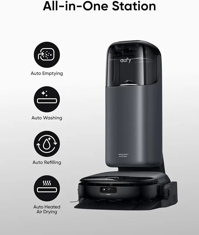 ·10-in-1 UniClean️ Station for Hassle-Free Cleaning This powerful station offers automated features, including auto-emptying, auto-washing, auto-refilling, auto-heated air drying, auto wastewater collection, auto detergent dispensing, touch control, a sealed dust bag, and 20% faster charging.* It ensures unparalleled ease and efficiency, providing a worry-free cleaning experience like never before.*Based on eufy internal testing, 20% faster charging than the previous generation product.
