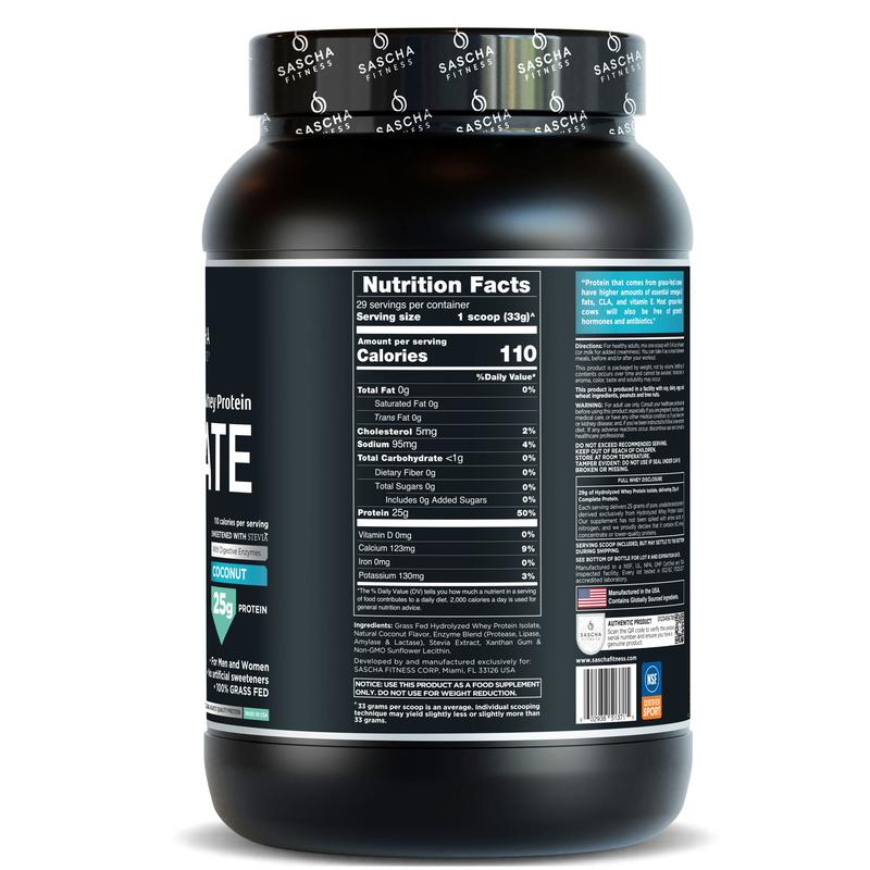Grass Fed Hydrolyzed Whey Protein Isolate, Natural Coconut Flavor, Enzyme blend (Protease, Lypase, Amylase and Lactase), Stevia extract, Xanthan gum & Non-GMO Sunflower lecithin.