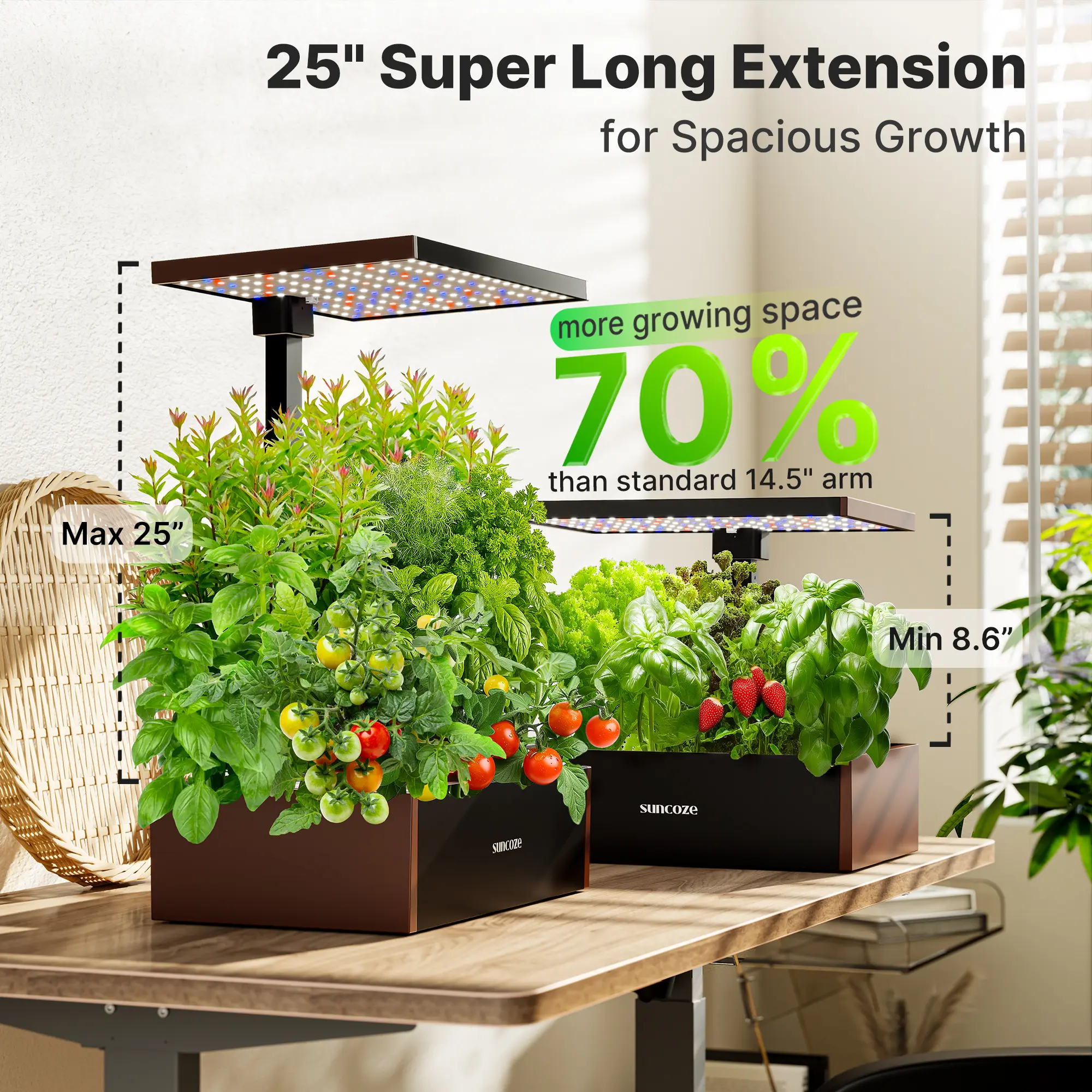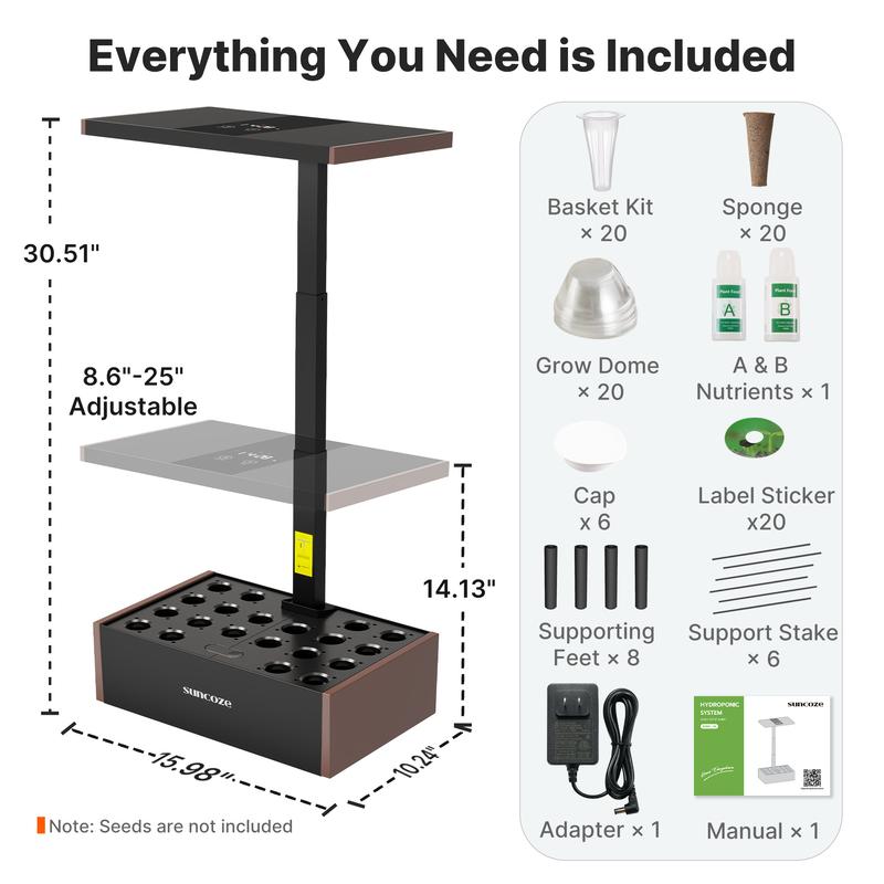 【Up to 25" Height-adjustable Pole】This indoor herb garden with grow light features a height-adjustable pole that extends from 8.6" to 25", providing full light exposure for plants at every growth stage. Perfect for plants and flowers of various heights. Plus, the detachable pole makes cleaning the tank easy and helps prevent short circuits.