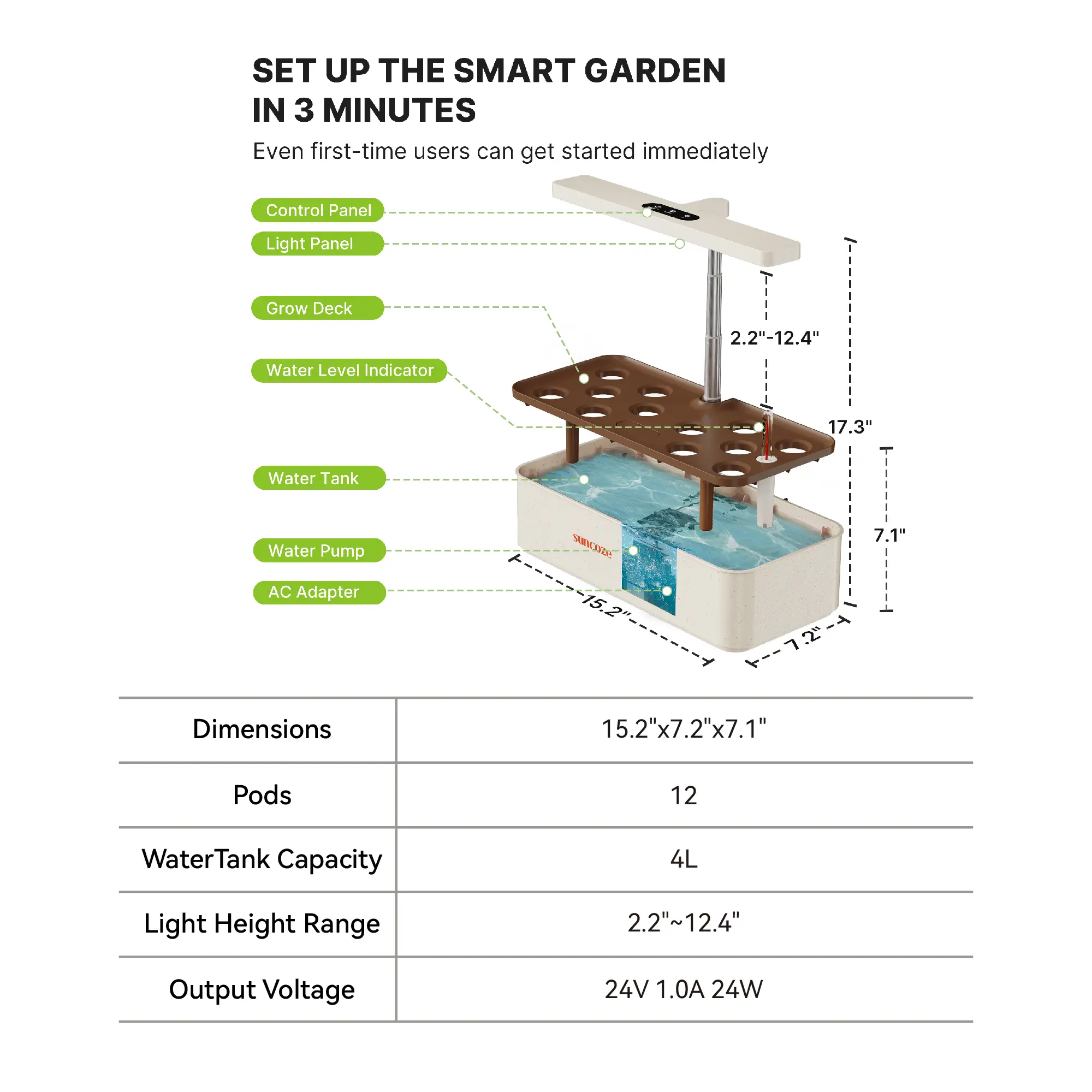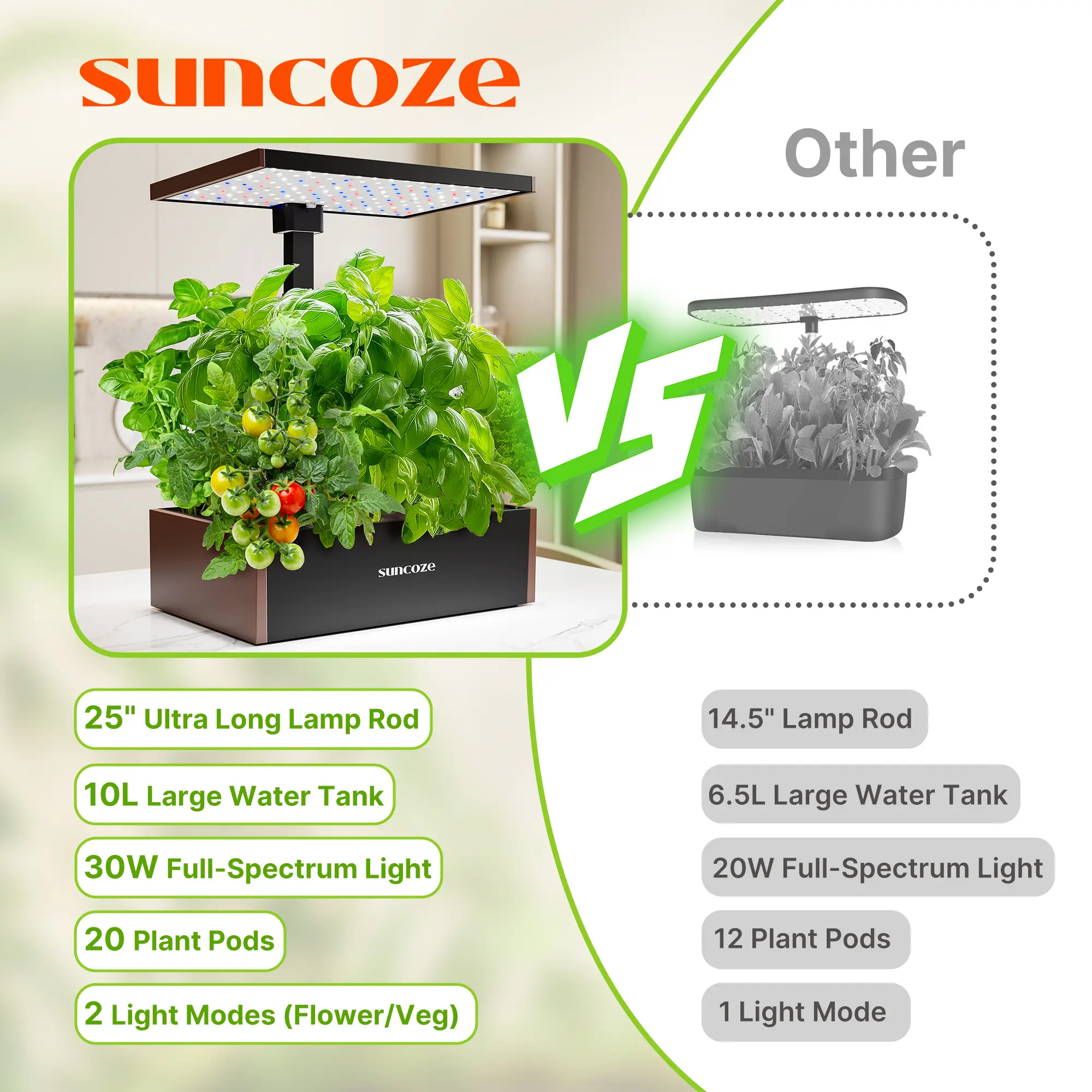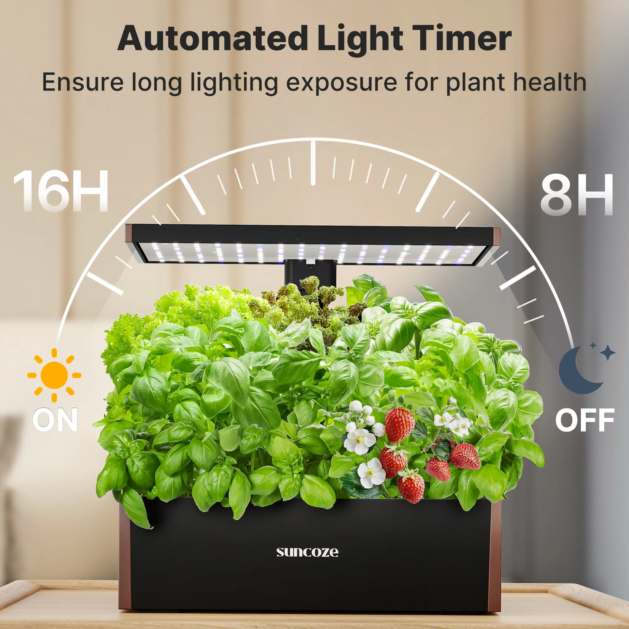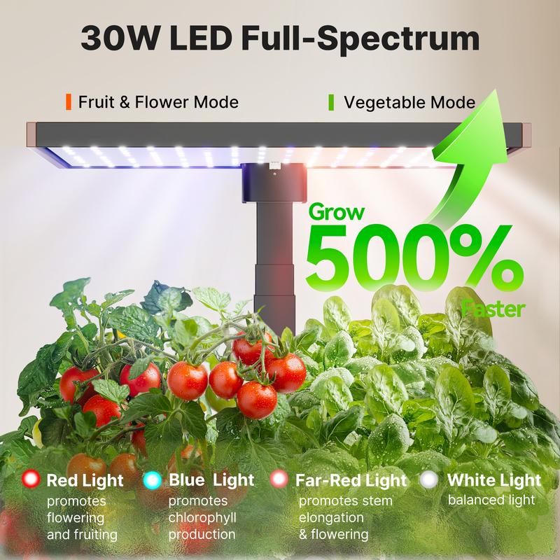 【30W Light Panel & 2 Growth Modes】The SUNCOZE herb garden planter indoor kit features an efficient 30W full-spectrum LED grow light that mimics the effects of natural sunlight. It automatically operates on a 24-hour cycle (16 hours on, 8 hours off). Simply select the veggie or flower & fruit mode using the control panel buttons, and watch your plants thrive!
