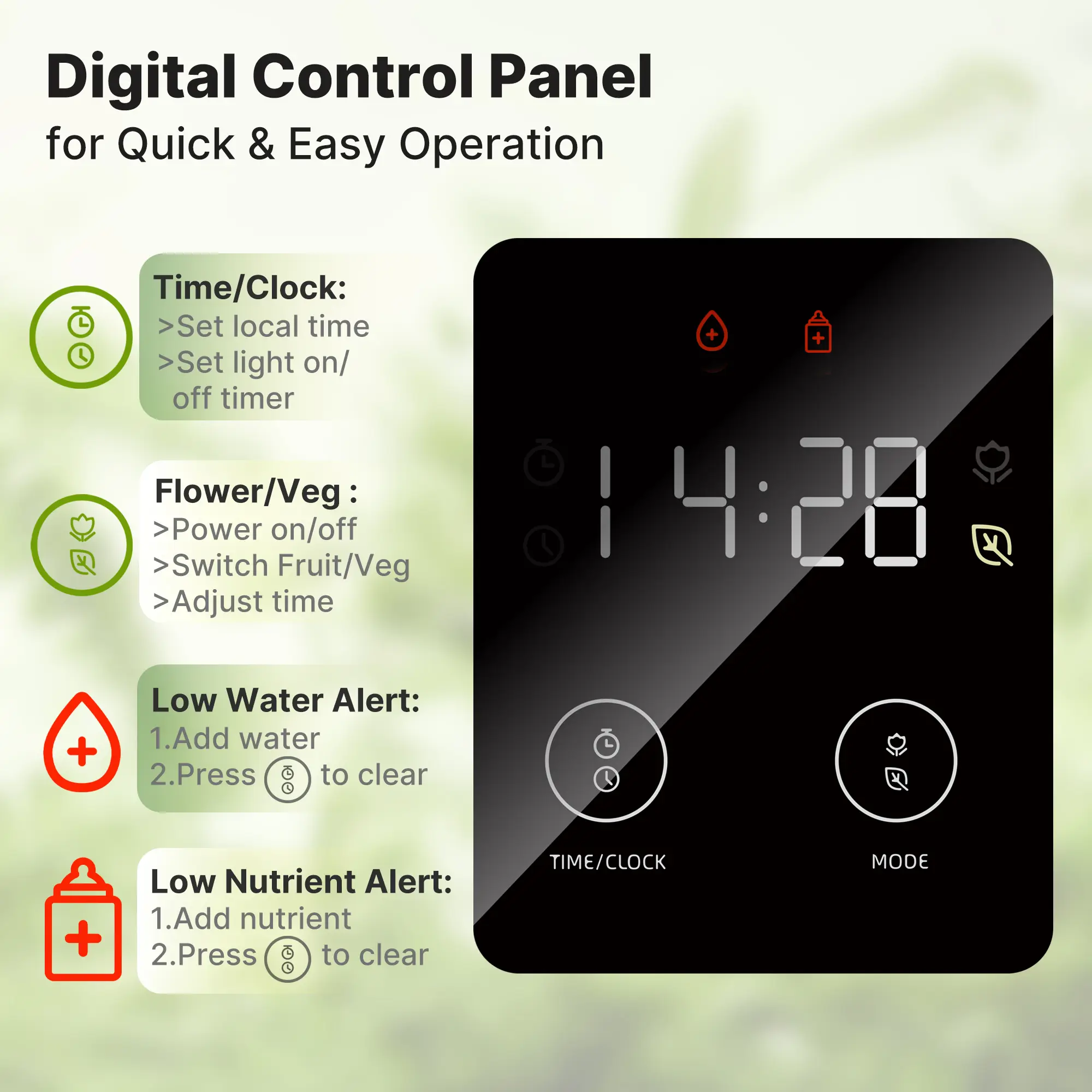 【Light Timer & Water Indicator】 This hydroponics growing system kit allows you to set the light start time to suit your unique growing needs. It also features water level indicators to ensure your plants stay healthy and thriving.