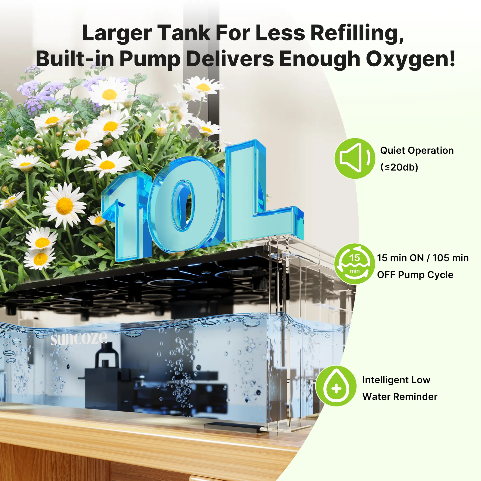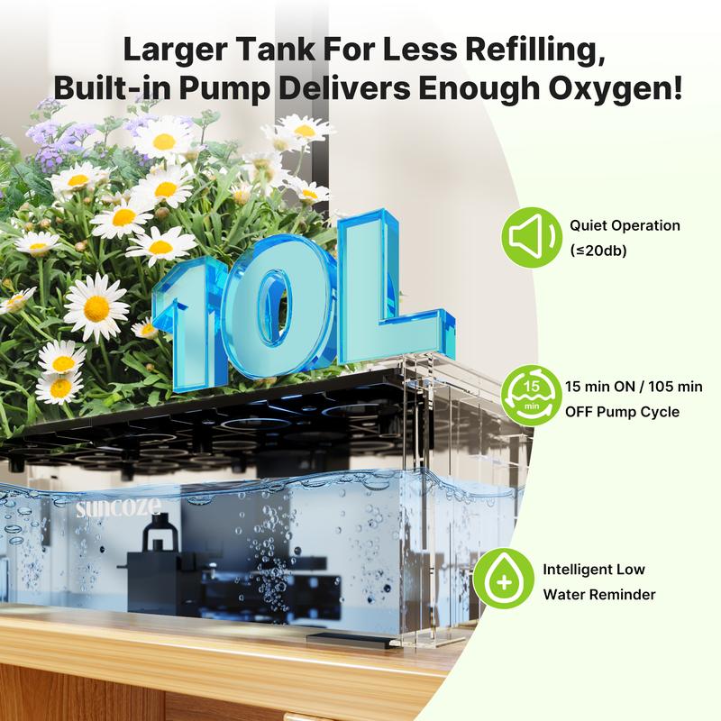 【10L Capacity & Quiet Pump】 This hydroponic growing system boasts a 10L water tank and a built-in silent pump. With plenty of space for root growth and efficient oxygen delivery, it ensures healthy plants. The pump operates in cycles, running for 15 minutes and resting for 1 hour 45 minutes, mimicking natural water flow in an ecological setting. Note: Please add water before use. The pump and light will not work without sufficient water.