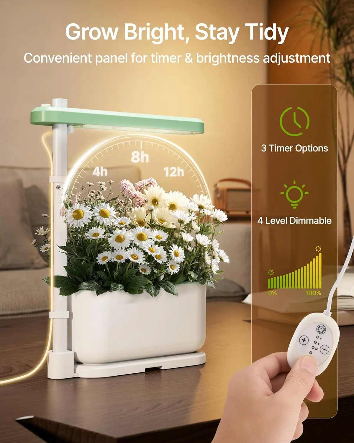 Control Panel for Light & Timer——With an intuitive controller, you can adjust brightness at 0%, 25%, 50%, 75%, or , and set timer modes for 4H/8H/12H cycles. This hydroponic system gives you full control over your ’ lighting needs—simple and efficient.