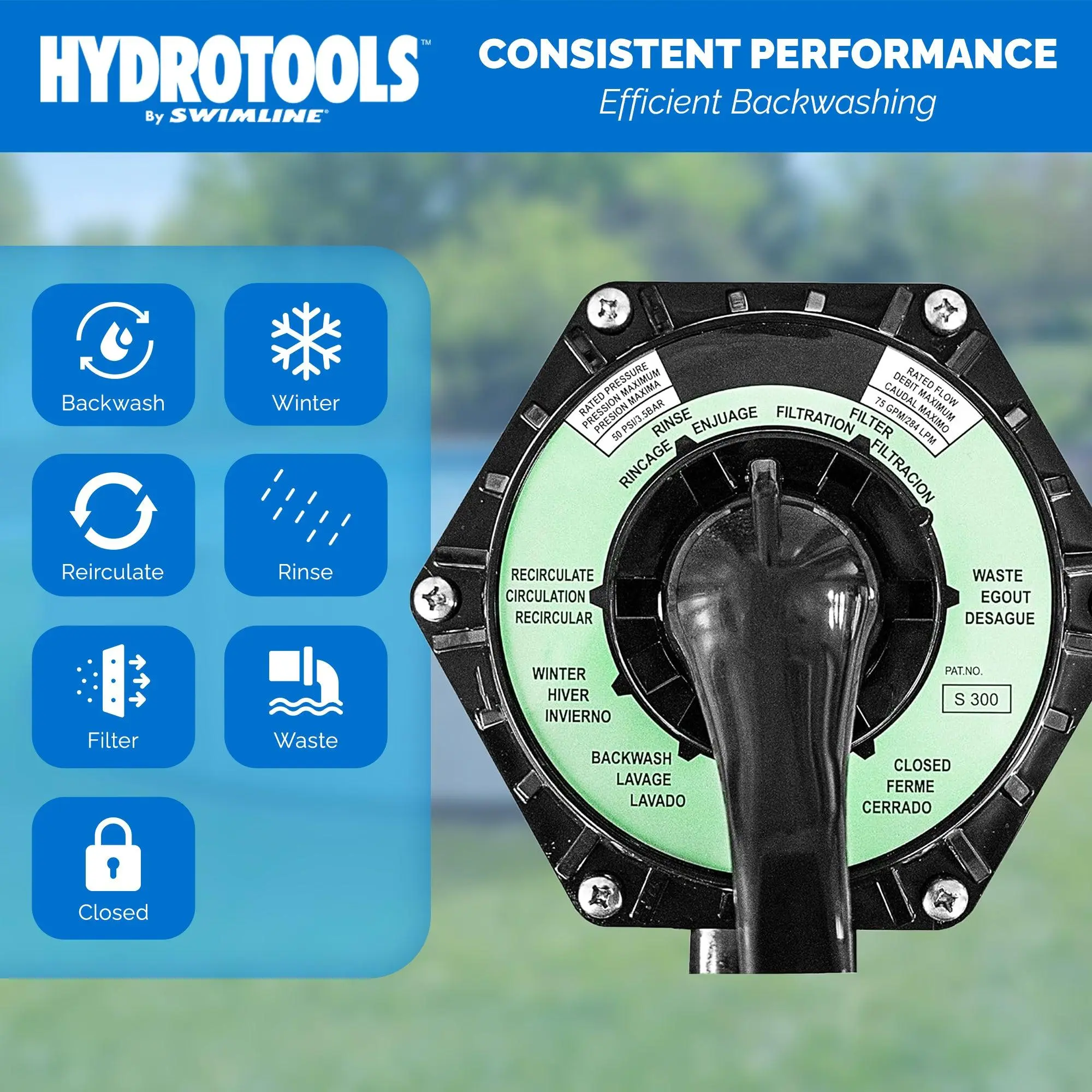 Integrated multi-port valve provides quick, easy-to-understand settings for optimal filtration performance; Backwash, rinse, filtration, and winter