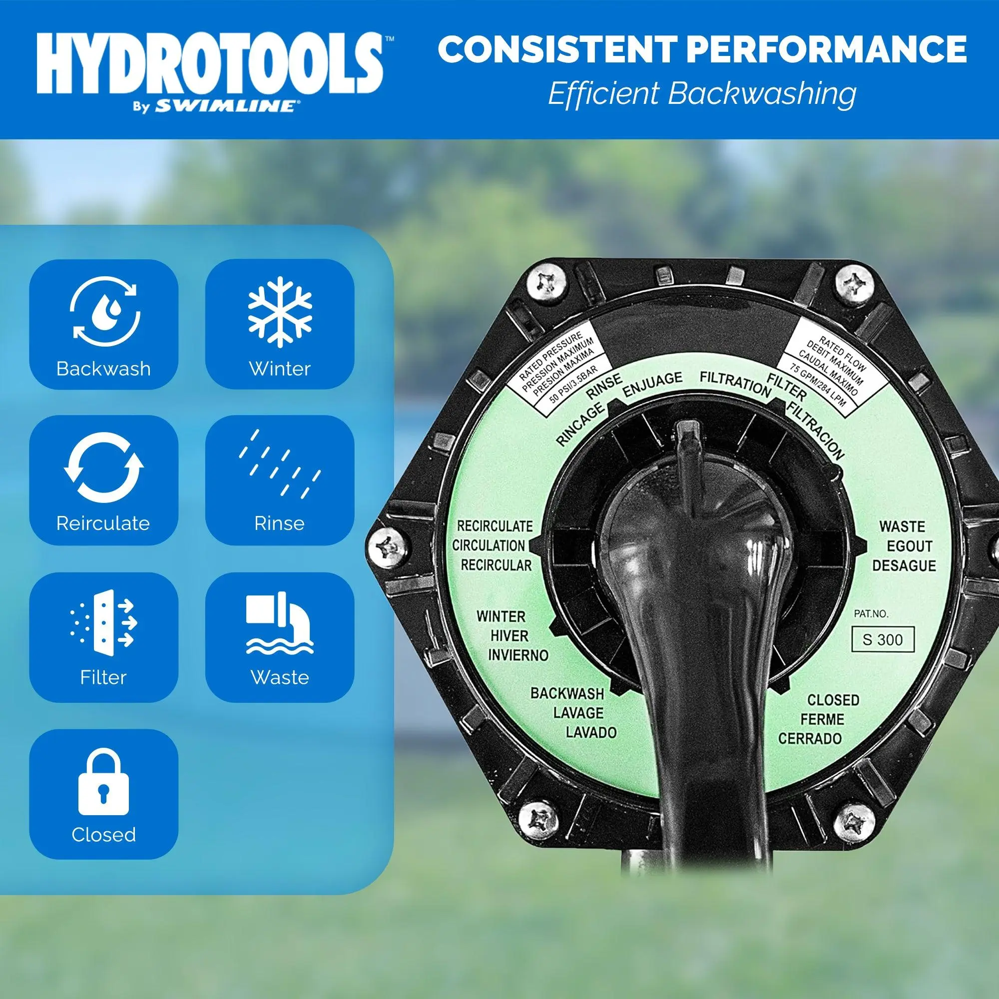 Integrated multi-port valve provides quick, easy-to-understand settings for optimal filtration performance; Backwash, rinse, filtration, and winter