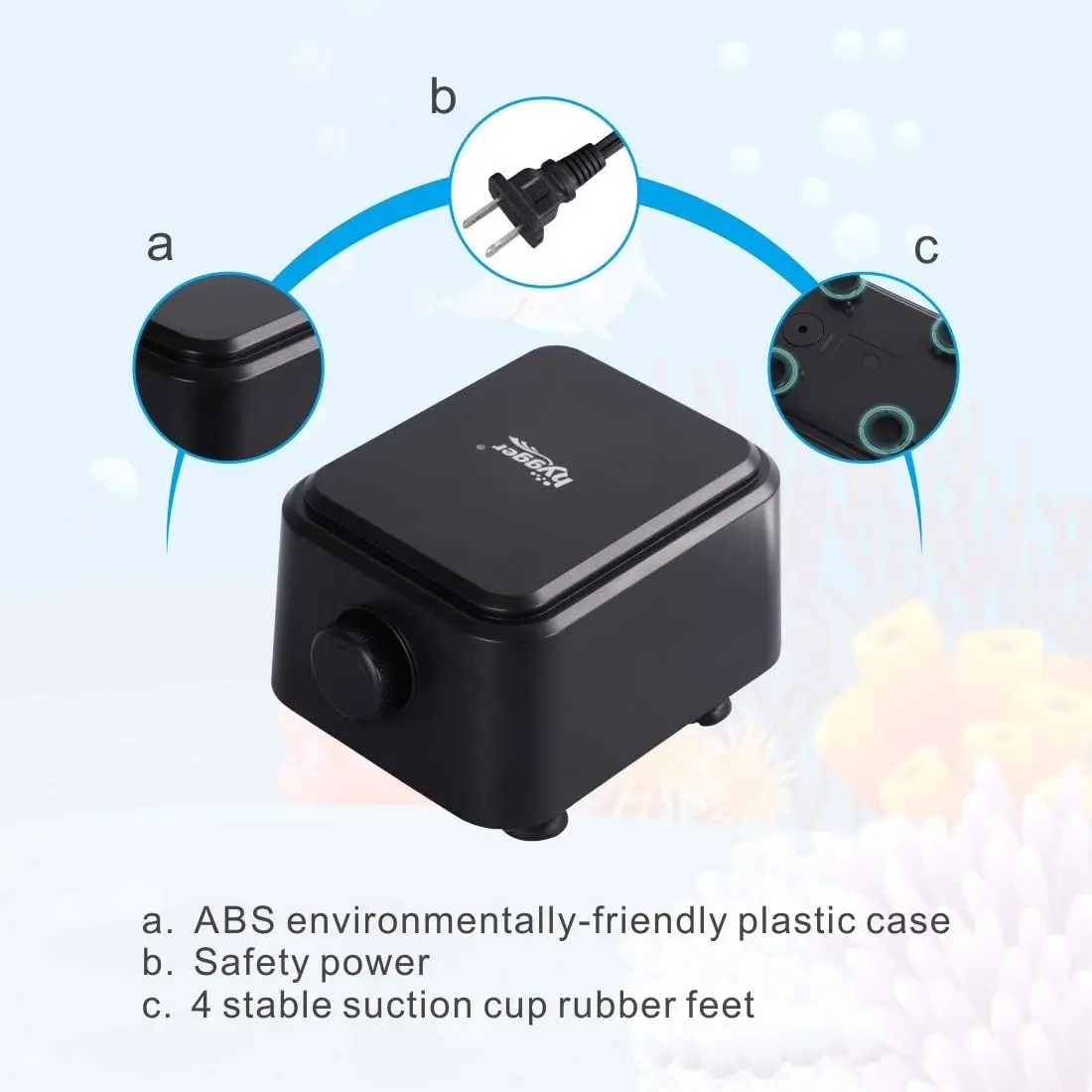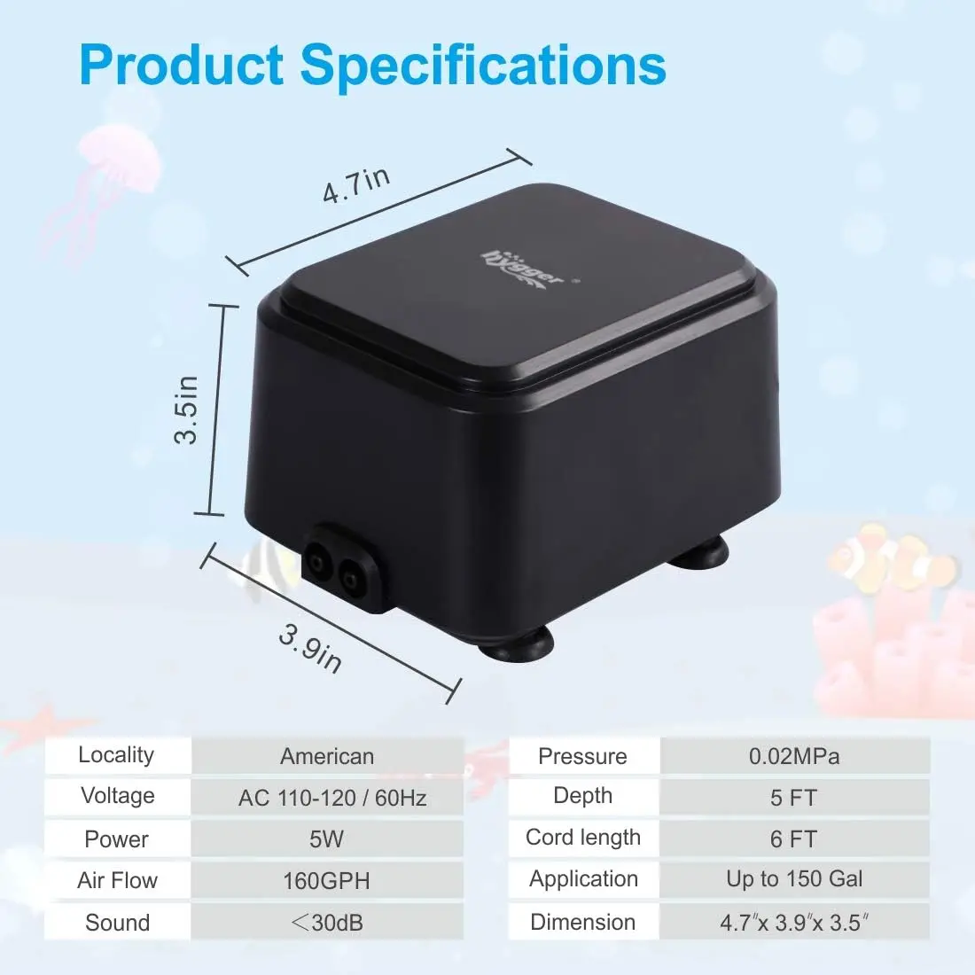 HG946 Product Specifications:Air Flow:255GPHPower:10WWeight:1.22KGNosie:<30dBPressure:0.04MpaPower cable:6 feetStomata:Double VentVoltage:AC 110V—120V 60HZApplication:up to 600 GalHG958 Product Specifications:Air Flow:160GPHPower:5WDepth:5FTNosie:<30dBPressure:0.02MpaPower cable:6 feetStomata:Double VentDimension:4.7"×3.9"×3.5"Voltage:AC 110V—120V 60HZApplication:up to 150 GalWarm Tips:The pump is NOT SUBMERSIBLE, please do not put it into the aquarium. Keep it dry.No check valve, the air pump should be placed above the water level of the fish tank(about 25cm).With a check valve, the air pump can be placed below the water surface or placed on the table. The check valve (note the installation direction) can prevent the water from flowing backward.To get the maximum airflow and extend air pump service life, we suggest cleaning airline tubing and airstone regularly.5W air pump: It is not recommended to connect less than 3 devices at most, and cannot exceed 5 feet water depth.10W air pump: It is not recommended to connect less than 4 devices at most, and cannot exceed 6 feet water depth.