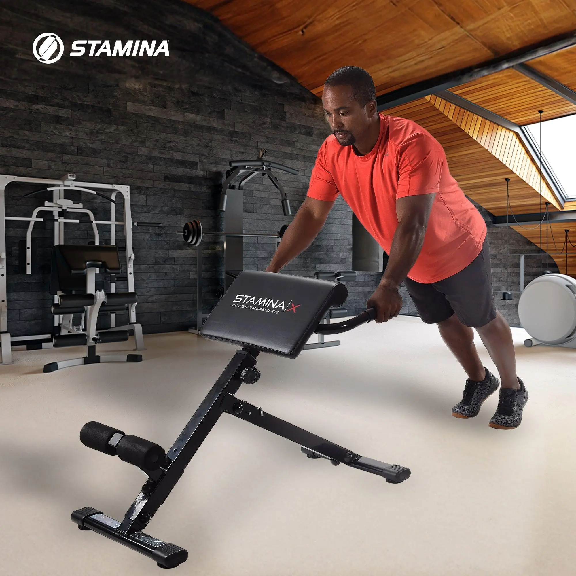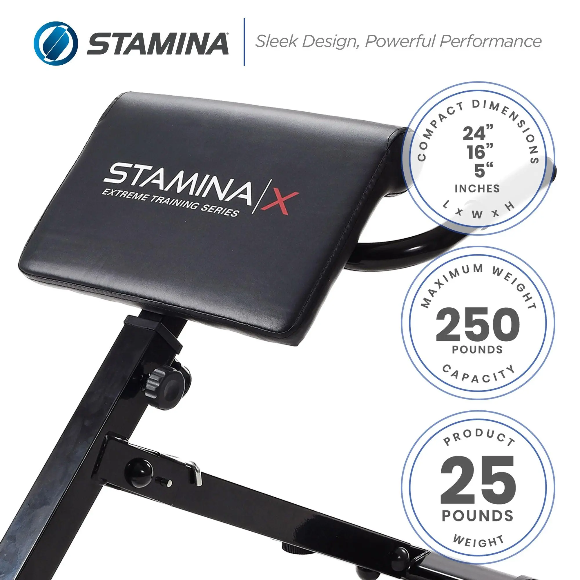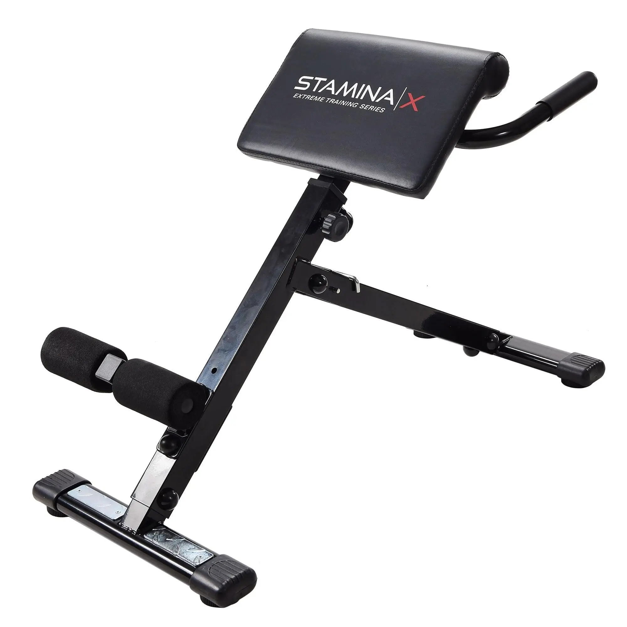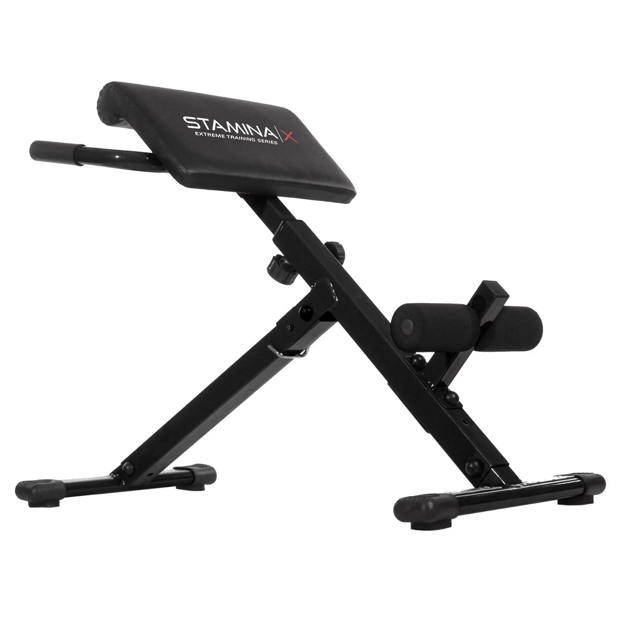 Strengthen your core with the Stamina X Hyper Bench. Ideal for back and abdominal exercises, this compact bench can be used with or without dumbbells (sold separately). It features padded supports, foam rollers, and non-slip footrests for comfort and safety. The foldable frame allows for easy storage, and floor protectors prevent damage. Supports up to 250 lbs for versatile at-home workouts.