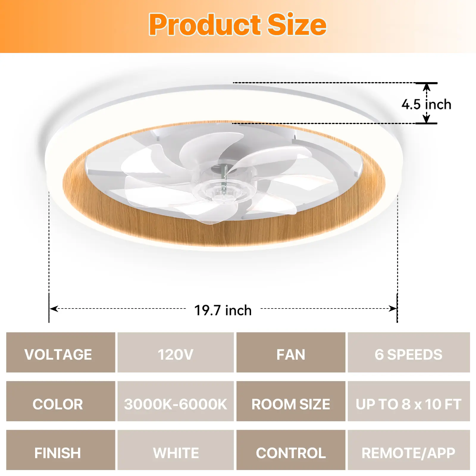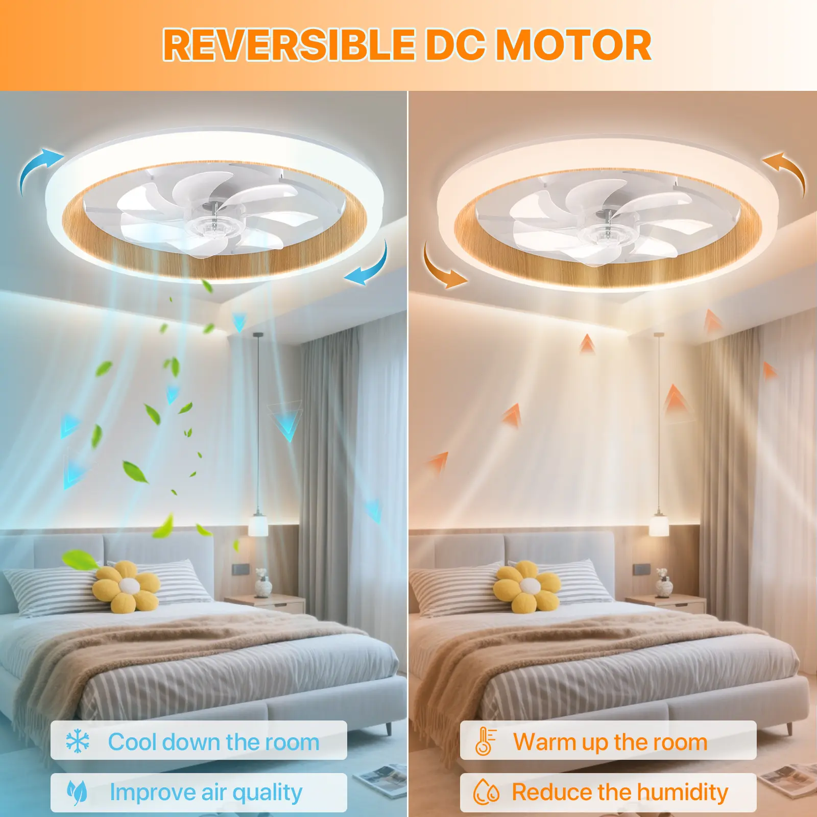 Smart Adjustable Lighting: Featuring adjustable color temperatures from 3000K to 6500K and stepless dimming, this flush mount ceiling fan with lights caters to diverse needs. Whether you prefer a warm glow for relaxation, a bright white for reading, or a neutral tone for gatherings, it provides the perfect lighting for every occasion. High-CRI LED bulbs reproduce true-to-life colors, creating a naturally illuminated atmosphere for your home