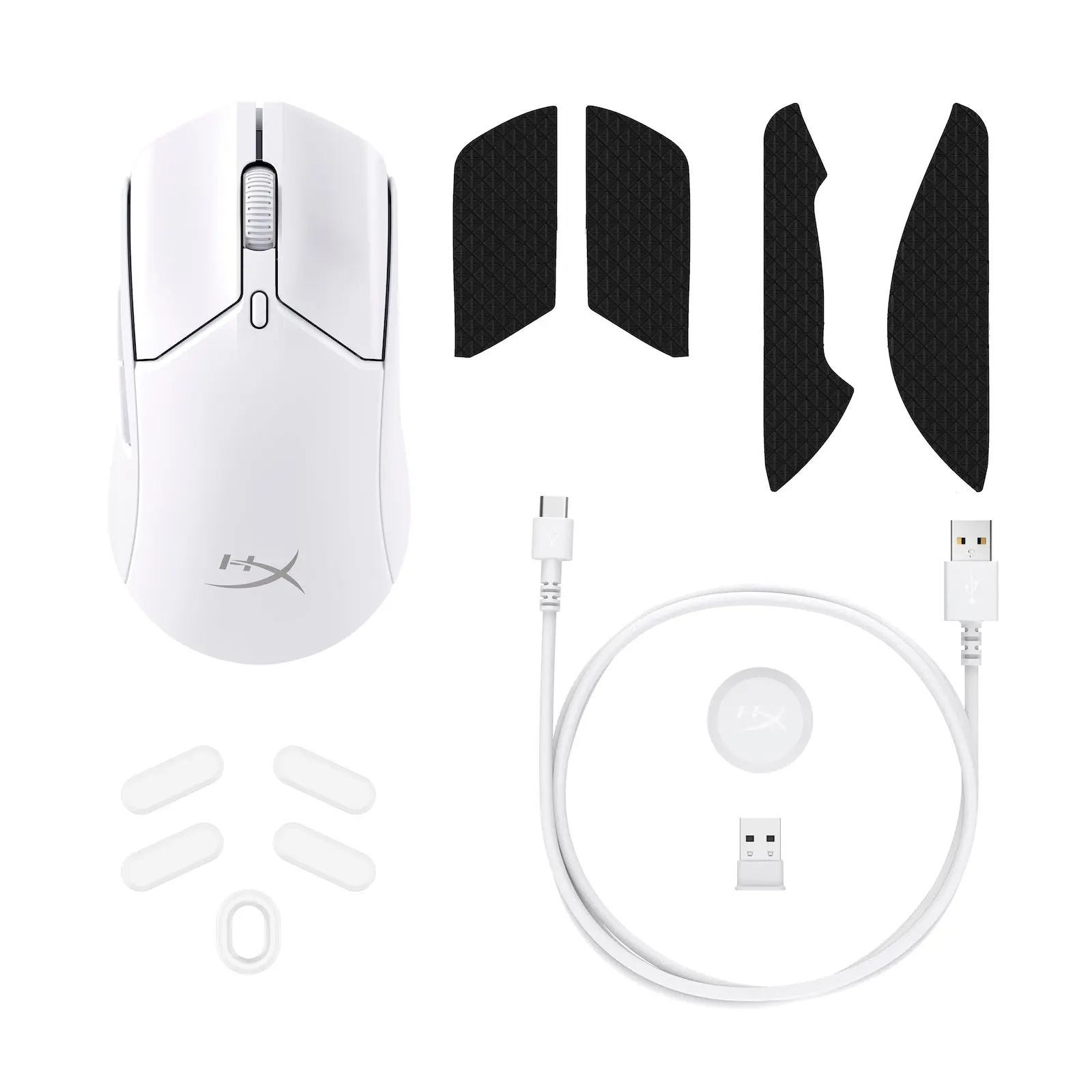 ·HyperX Pulsefire Haste 2, HyperX Grips, Low-Friction Skates, USB-C to USB-A Cable, USB Wireless Receiver, USB Extension Adapter, Quick Start Guide