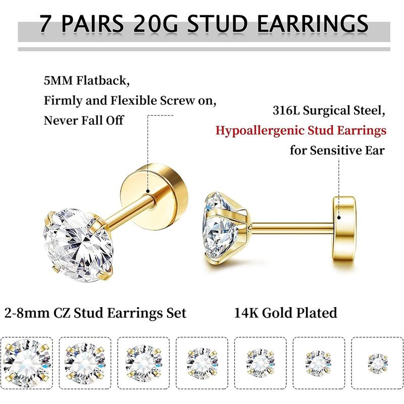 ·Comfortable to Wear : Highly polished finishing and strict metal electroplating craft makes super smooth and shiny surface, comfortable to wear. 2-8mm Clear cz flat back stud earrings, also can be used as tragus piercing, helix piercing, cartilage earrings.