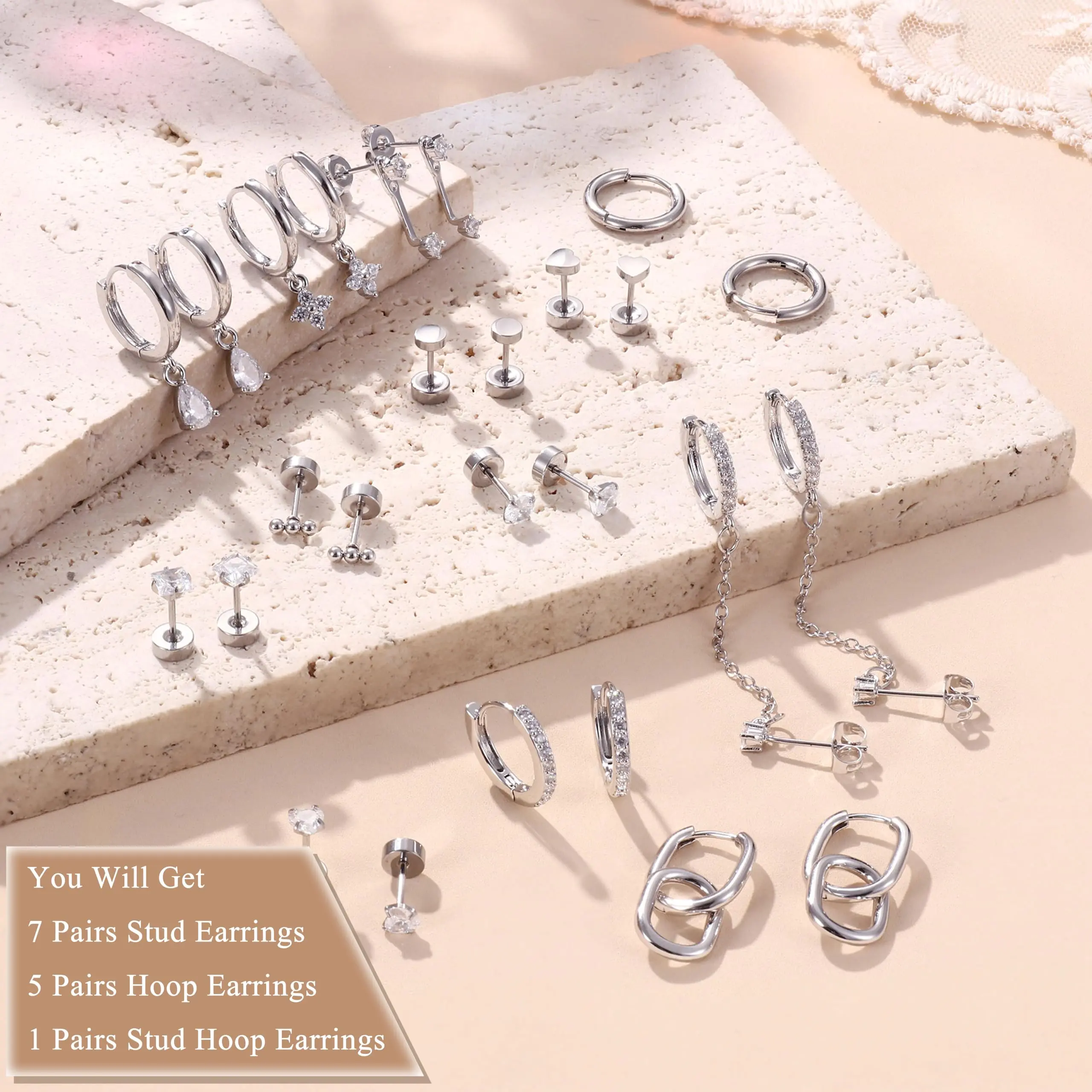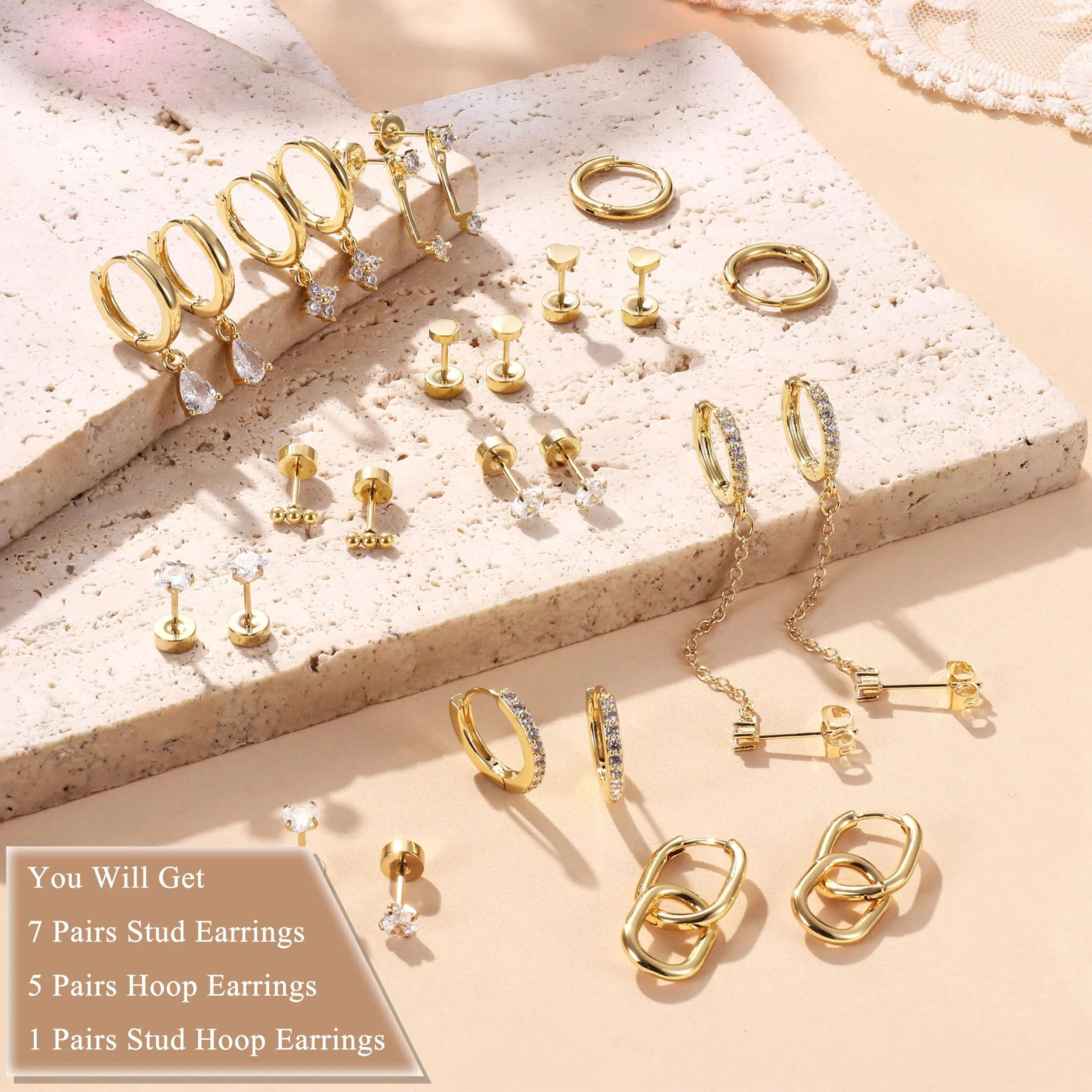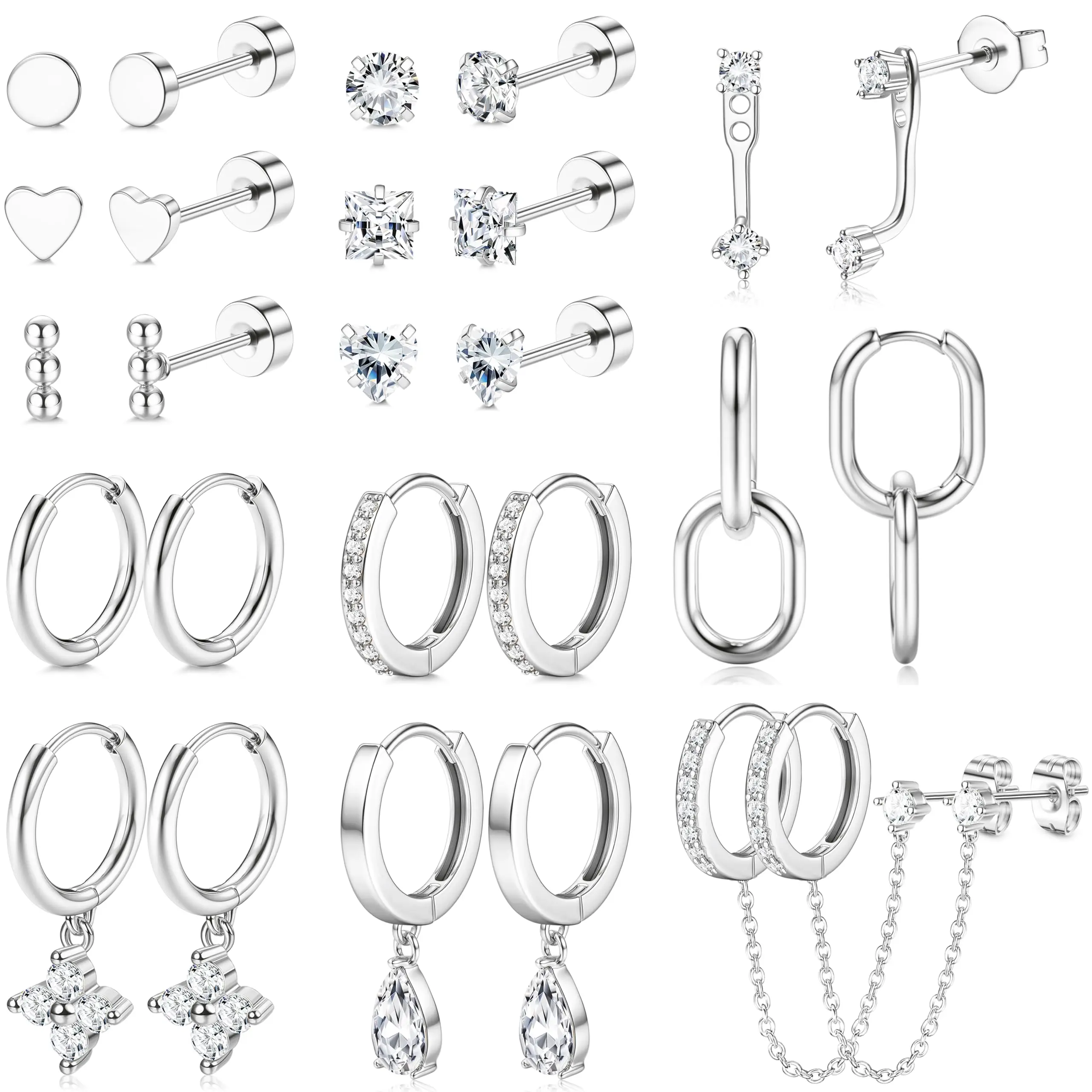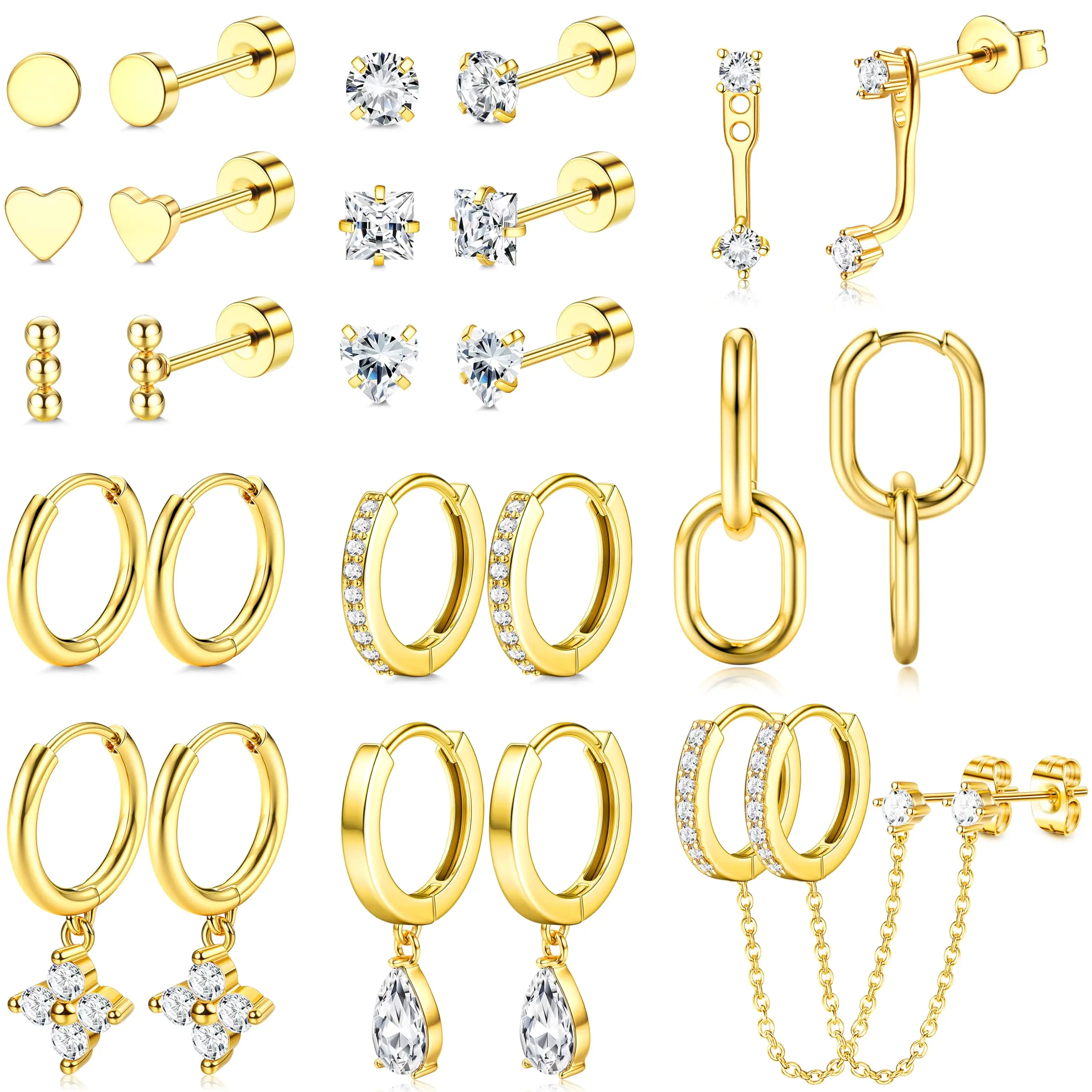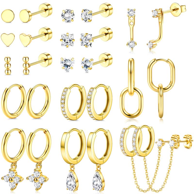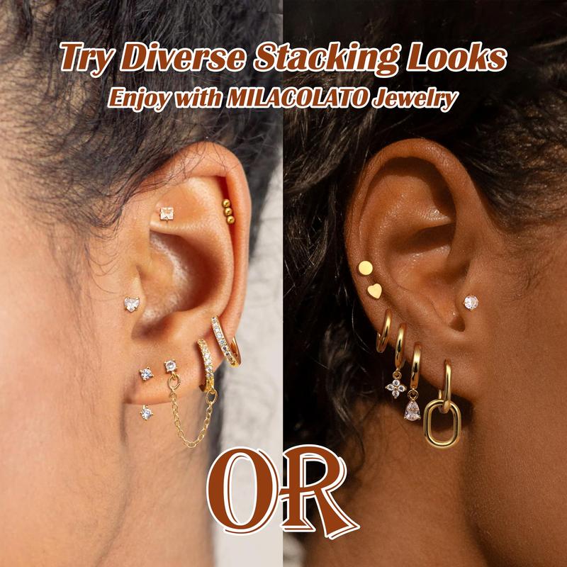 ·【Trendy Stud & Hoop Earrings Set for Stacks】13 pairs hypoallergenic earrings set with 300+ lab-tested combos, 6 pairs of flat back earrings, 3 pairs of dangle earrings, 2 pairs of small huggie hoop earrings, 1 pair of earrings jacket, 1 pair of chain stud earrings = 300+ Looks. From office-chic minimalism to layered party glam, effortlessly style every earring piercing from first ear lobes to cartilage