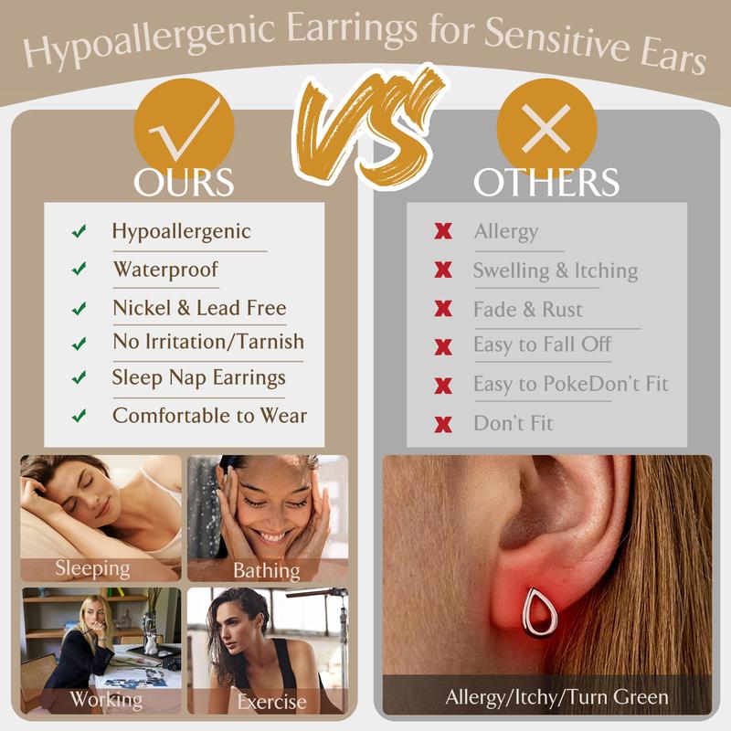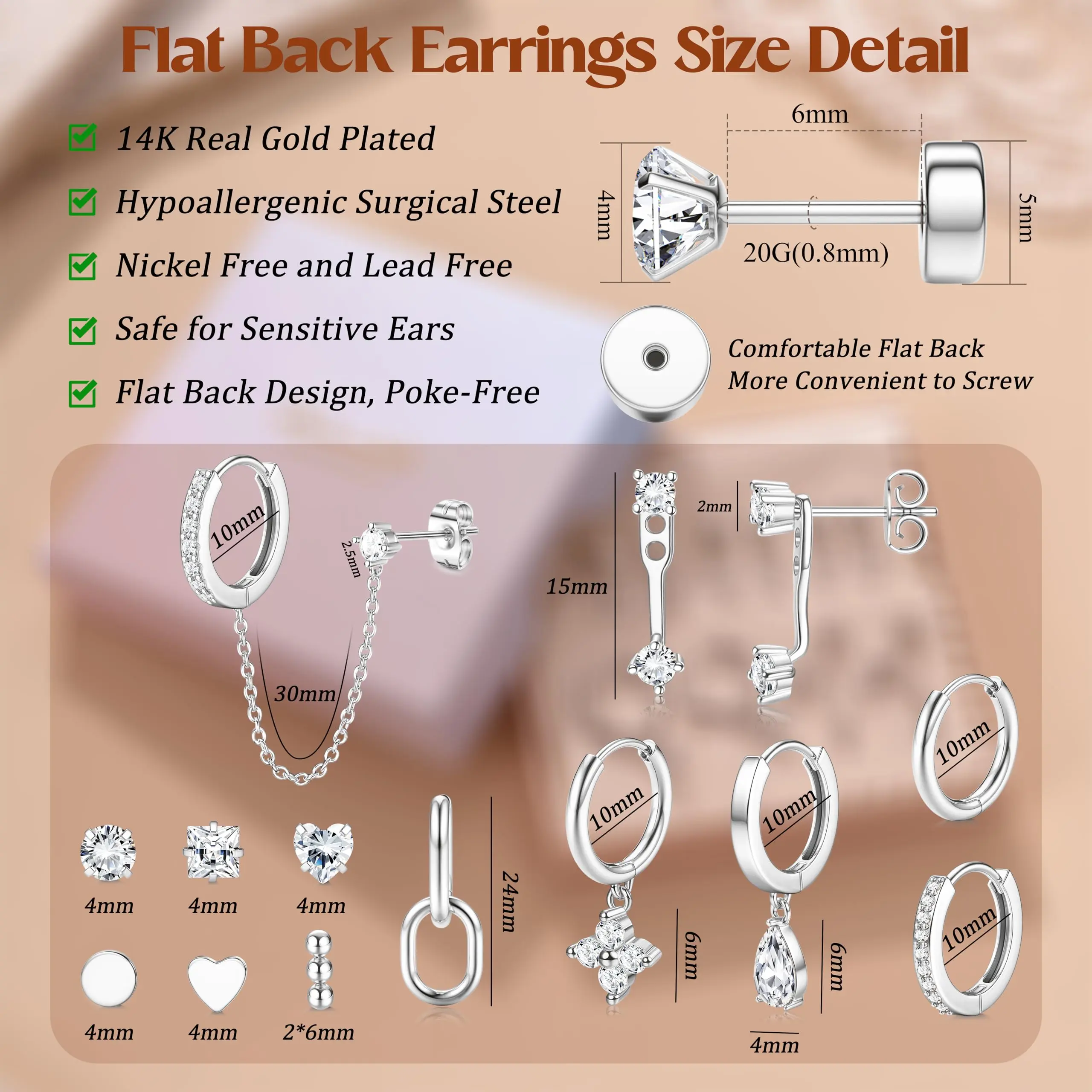 ·【20G Flat Back Earring Size】These hypoallergenic earrings for women feature 0.8mm(20g) posts with internally threaded screw backs for a secure fit, the 5mm smooth flat backs prevent hair snagging and ensure all-day comfort(IF YOU CAN'T SCREW OFF THE BACK, PLS USE THE SILVER CLOTH AS TOOL TO REMOVE IT), especially Poke-Free!!! Flat back earrings stay in place during sleep, exercise, providing seamless comfort