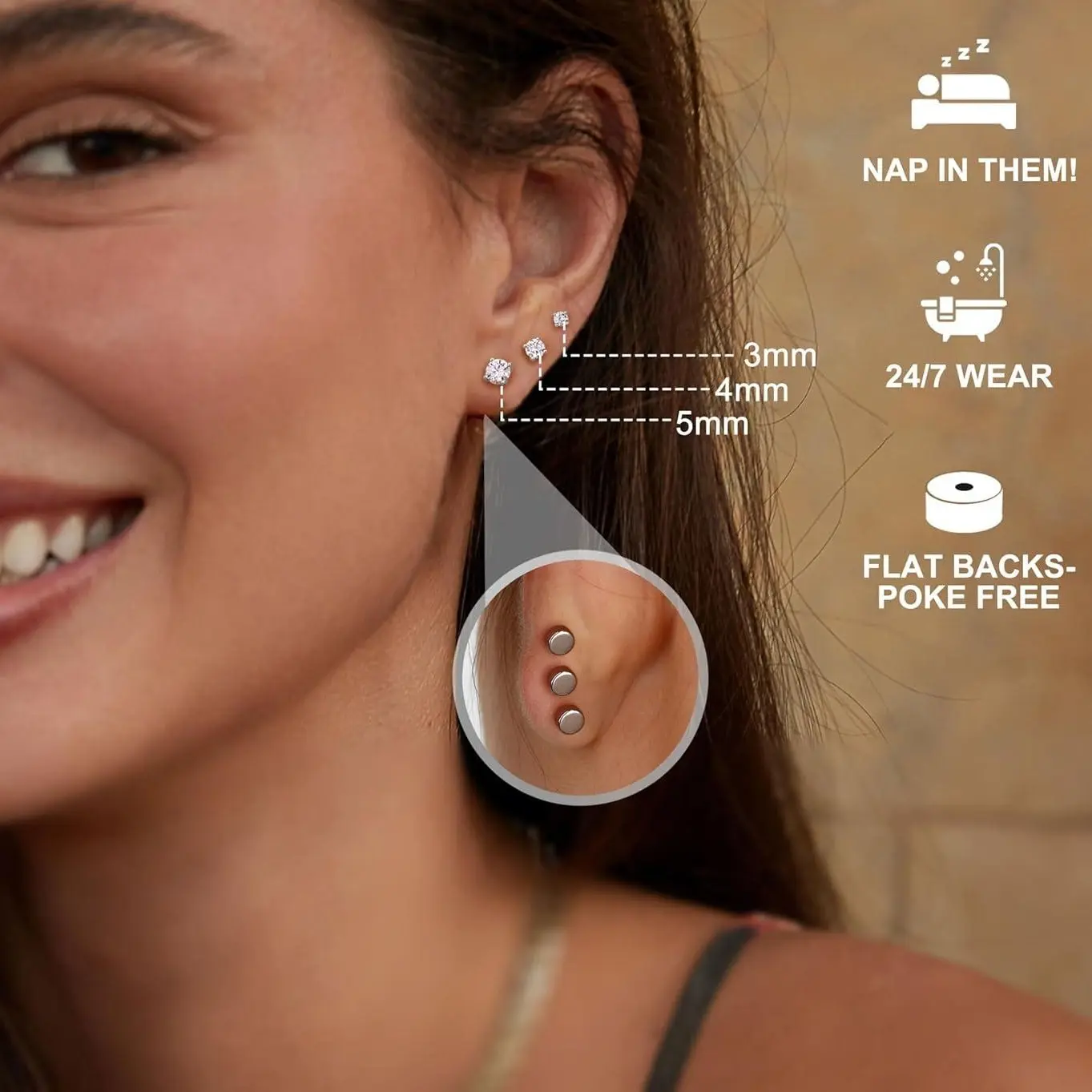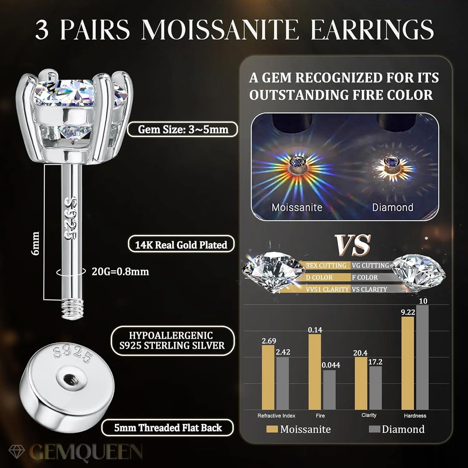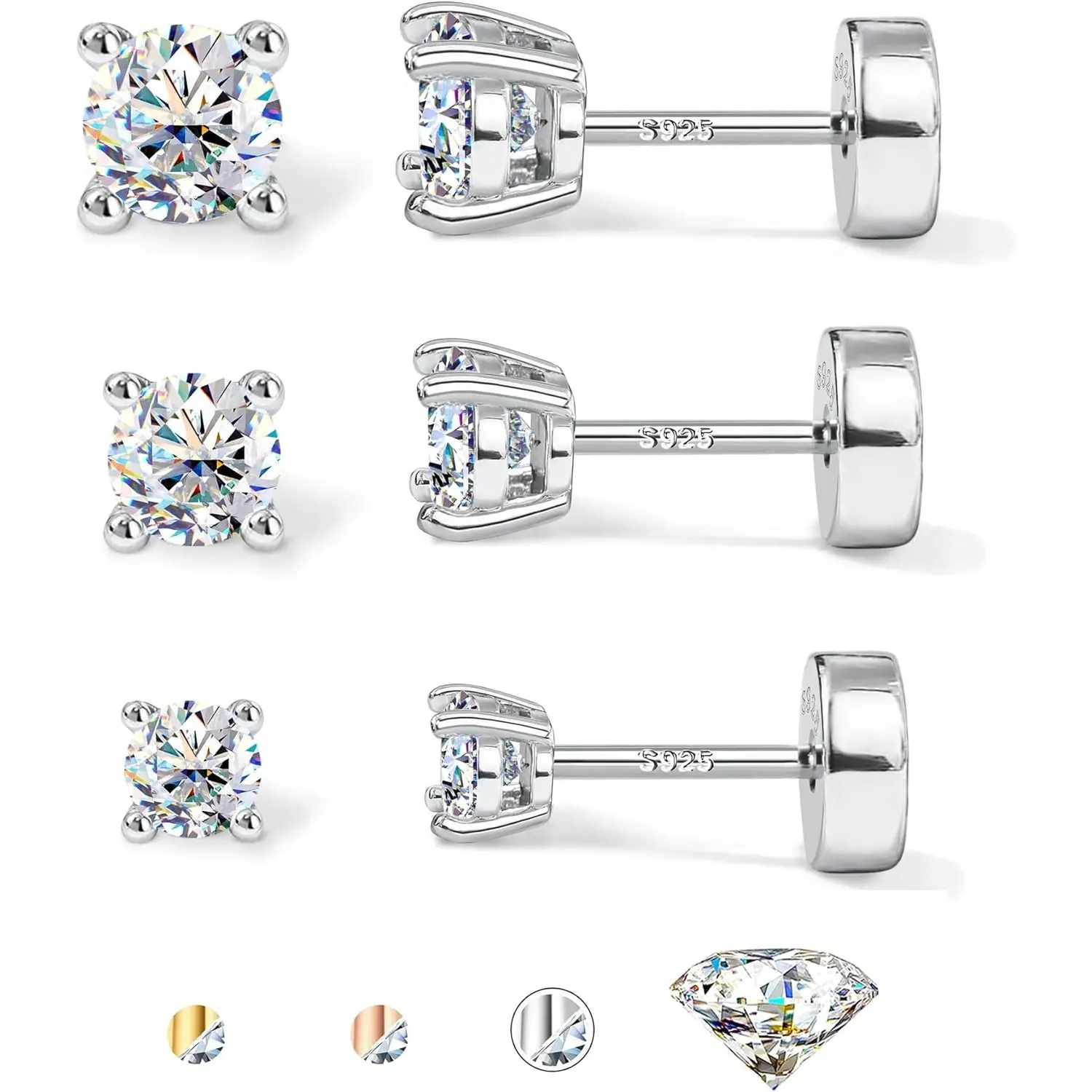 ·Synthetic Versatile Moissanite Earrings Sets Size : One set includes 3 pairs flat back earrings with 3mm, 4mm, and 5mm brilliant round cut D color, VVS1 clarity moissanite, securely set with 4-prong design. With a post length of 6.5mm and a post diameter of 0.8mm(20G), these dainty sterling silver jewelry are perfect as cartilage earring, helix piercing jewelry, tragus piercing jewelry, first, second, third Lobe hole earrings studs, suitable for both men and women.