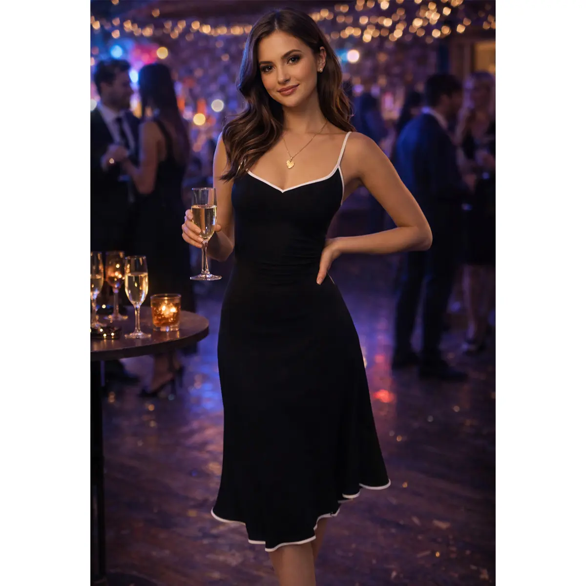 The classic solid color base is elevated with crisp white piping along the sweetheart neckline, thin spaghetti straps, and a gently flared hem, giving it a polished, eye-catching finish. Whether you’re heading to a brunch, a night out, or a vacation, this dress transitions seamlessly from day to night. It’s machine washable for easy care and comes in a range of sizes to suit every body type.