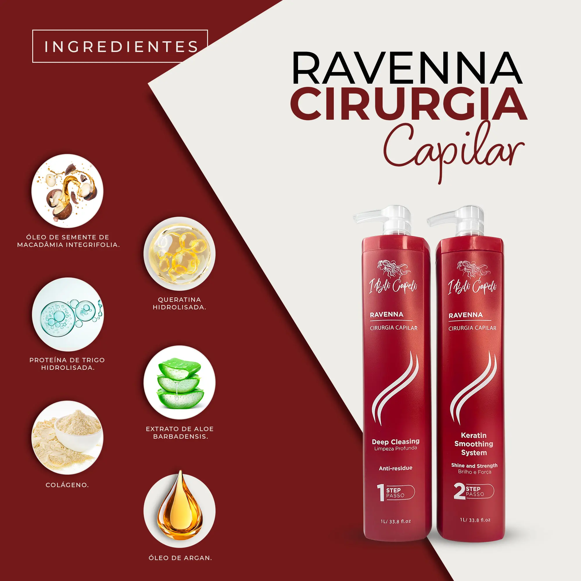 Ravenna b-tox repair traditional was developed with a combination of argan oil in synergy with panthenol, quaternized keratin and biotin, with the aim of promoting hair reconstruction, reducing hair breakage and returning nutrients to the hair. It has the capacity for great penetration in the threads, providing intense hydration and mass replacement.