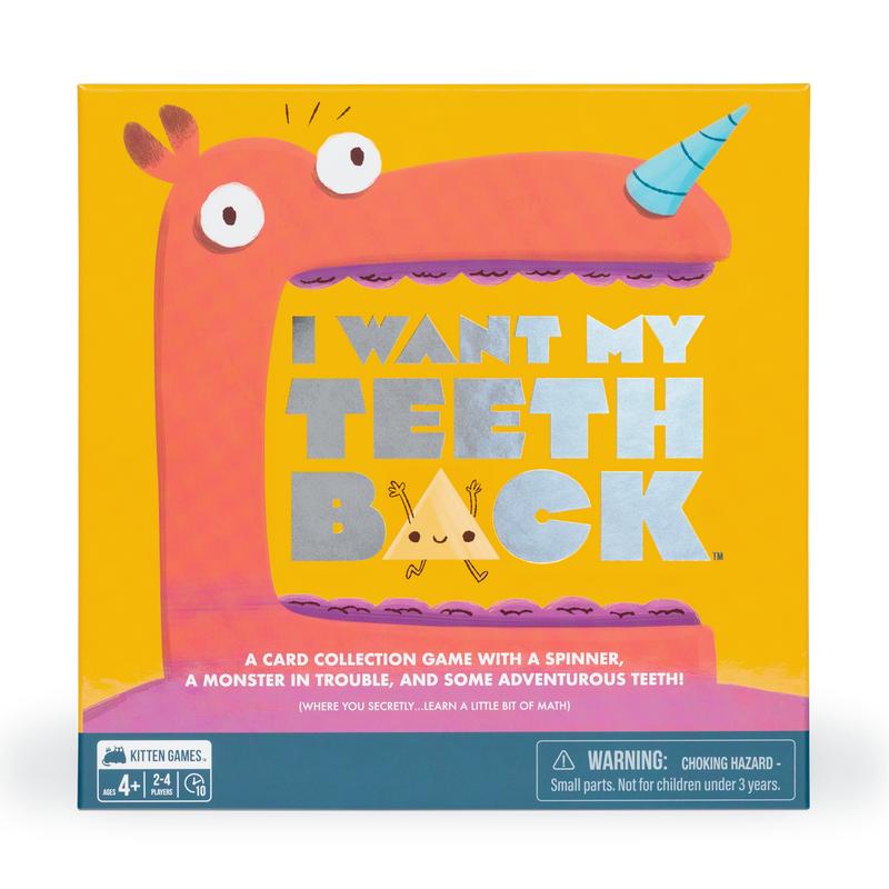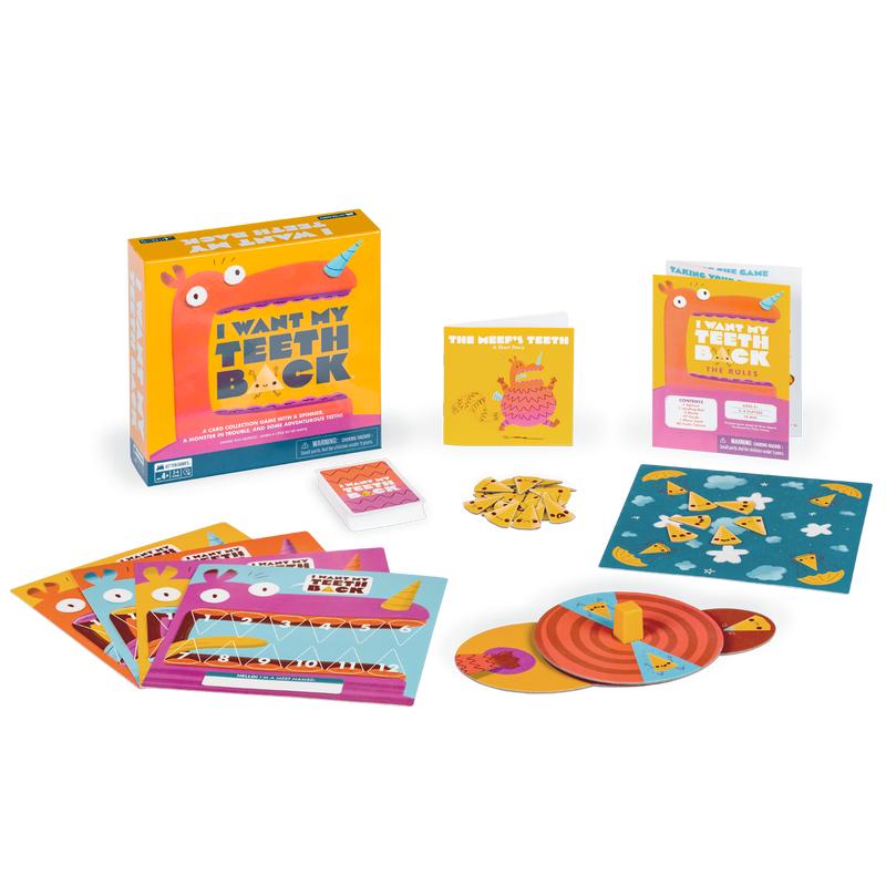 In I Want My Teeth Back, players collect cards and use the spinner to fill Meef’s smile with teeth. The first to complete their monster’s toothy grin wins! Along the way, kids practice counting, addition, and decision-making—all wrapped in a fun and engaging story.