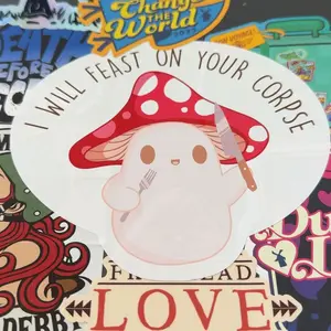 The design features a bold mushroom graphic that's sure to make a statement. Get ready to spook your friends with this must-have design. Perfect for Halloween or any other occasion that calls for a little bit of macabre fun. Shop now and make your wardrobe a little more thrilling! Stick your personality just about anywhere with our vibrant die cut stickers! There's no place where your passions can't shine, that's why we created our stickers to be placed on your favorite items such as: laptops, water bottles, notebooks, car bumpers, skateboards, and much more. The options are truly endless, but your interests don't have to be. Available in multiple sizes.