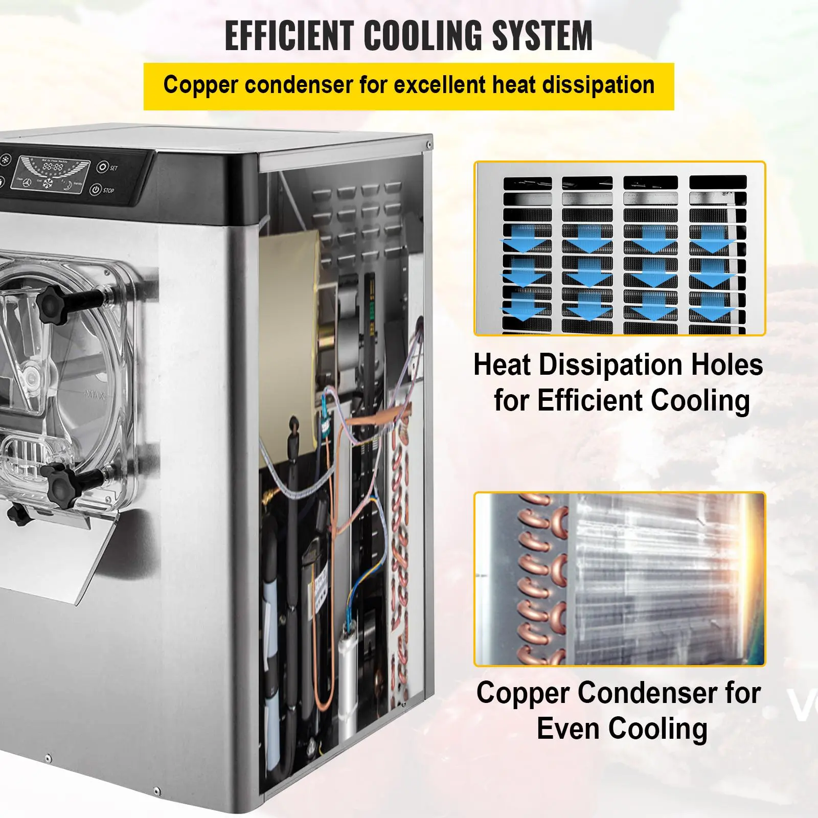 • Fast Heat Dissipation: Adopted a high-efficiency cooling system, the built-in copper tube condenser improves even cooling and heat dissipation. And the side of the hard ice-cream machine has ventilation design, which enhances the efficiency of cold and heat conversion and ensures good heat dissipation. Provide a machine for long time use.